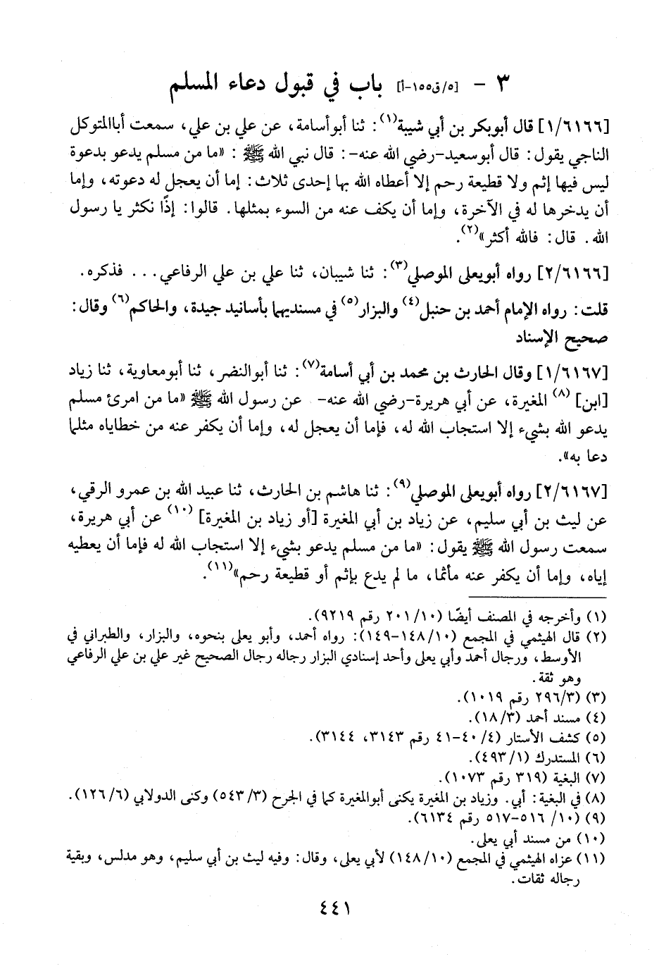 6167 / 2 - رَوَاهُ أَبُو يَعْلَى الْمَوْصِلِيُّ: ثَنَا هَاشِمُ بْنُ الْحَارِثِ، ثَنَا عُبَيْدُ اللَّهِ بْنُ عَمْرٍو الرَّقِّيُّ، عَنْ لَيْثِ بْنِ أَبِي سُلَيْمٍ، عن زياد بن أبي المغيرة أو زياد بن الْمُغِيرَةِ، عَنْ أَبِي هُرَيْرَةَ، سَمِعْتُ رَسُولَ اللَّهِ - صَلَّى اللَّهُ عَلَيْهِ وَسَلَّمَ - يَقُولُ: "مَا مِنْ مُسْلِمٍ يَدْعُو بِشَيْءٍ إِلَّا اسْتَجَابَ اللَّهُ لَهُ فَإِمَّا أَنْ يُعْطِيَهُ إِيَّاهُ، وَإِمَّا أَنْ يُكَفِّرَ عَنْهُ مَأْثَمًا، مَا لَمْ يَدْعُ بِإِثْمٍ أَوْ قطيعة رحم".