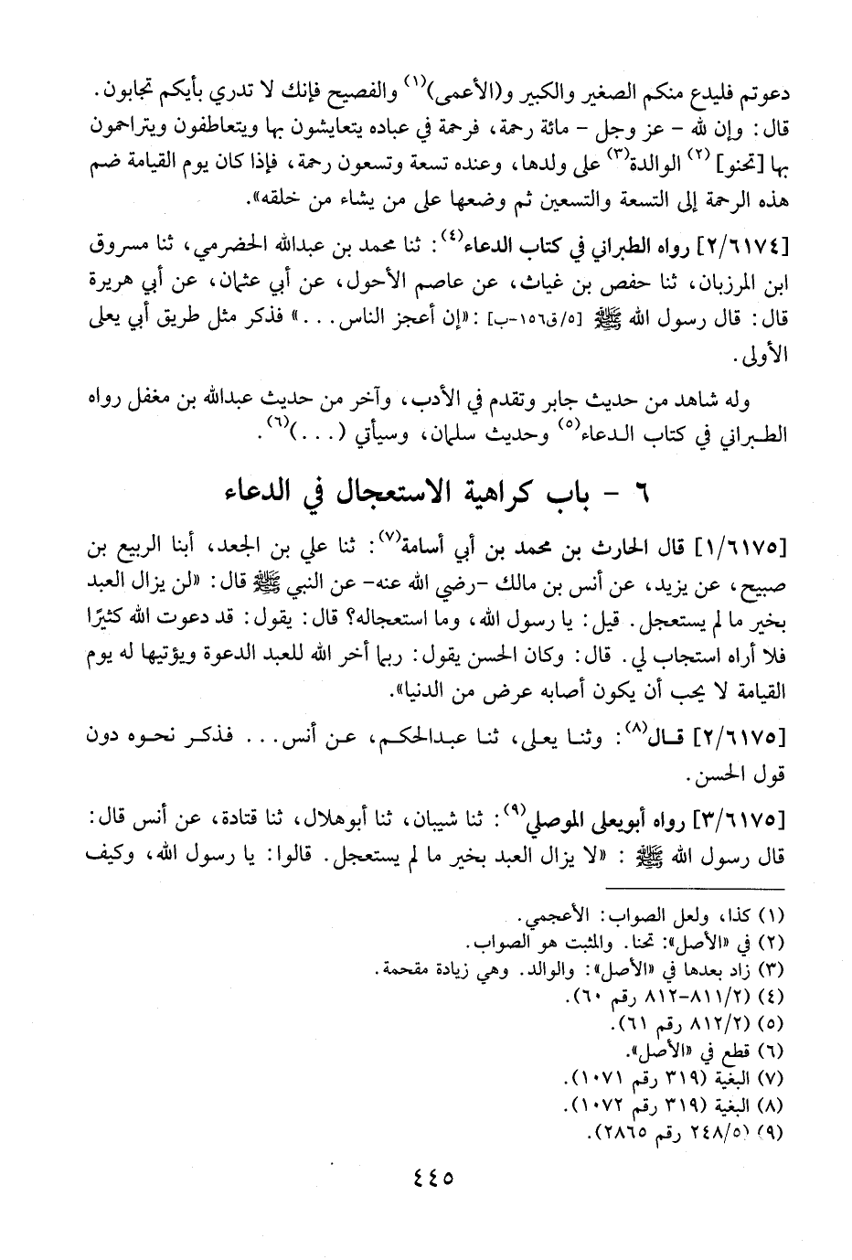 6175 / 1 - قَالَ الْحَارِثُ بْنُ مُحَمَّدِ بْنِ أَبِي أُسَامَةَ: ثنا علي بن الجعد، أبنا الرَّبِيعُ بْنُ صُبَيْحٍ، عَنْ يَزِيدَ، عَنْ أَنَسِ بْنِ مَالِكٍ- رَضِيَ اللَّهُ عَنْهُ- عَنِ النَّبِيِّ - صَلَّى اللَّهُ عَلَيْهِ وَسَلَّمَ - قَالَ: "لَنْ يَزَالَ العبد بخير مالم يَسْتَعْجِلْ. قِيلَ: يَا رَسُولَ اللَّهِ، وَمَا اسْتِعْجَالُهُ؟ قَالَ: يَقُولُ: قَدْ دَعَوْتُ اللَّهَ كَثِيرًا فَلَا أَرَاهُ اسْتَجَابَ لِي. قَالَ: وَكَانَ الْحَسَنُ يَقُولُ: رُبَّمَا أَخَّرَ اللَّهُ لِلْعَبْدِ الدَّعْوَةَ وَيُؤْتِيهَا لَهُ يَوْمَ الْقِيَامَةِ لَا يُحِبُّ أَنْ يَكُونَ أَصَابَهُ عَرَضٌ مِنَ الدُّنْيَا".