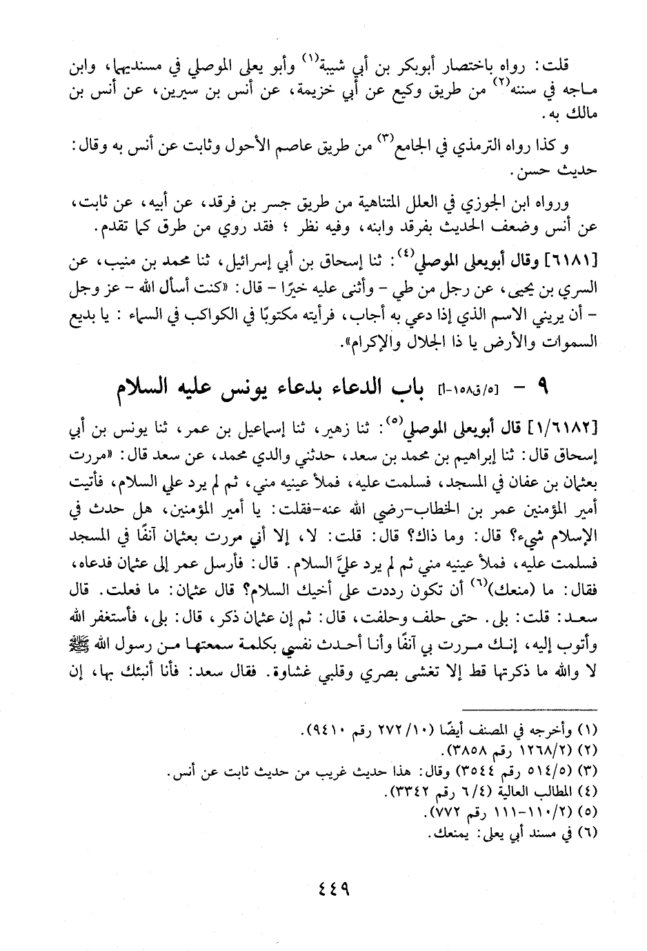 6182 - قَالَ أَبُو يَعْلَى الْمَوْصِلِيُّ: ثَنَا زُهَيْرٌ، ثَنَا إِسْمَاعِيلُ بْنُ عُمَرَ، ثَنَا يُونُسُ بْنُ أَبِي إِسْحَاقَ قَالَ: ثَنَا إِبْرَاهِيمُ بْنُ مُحَمَّدِ بْنِ سَعْدٍ، حَدَّثَنِي وَالِدِي مُحَمَّدٌ، عَنْ سَعْدٍ قَالَ: "مَرَرْتُ بِعُثْمَانَ بْنِ عَفَّانَ فِي المسجد، فسلمت عليه، فملأ عينيه مني، ثم لَمْ يَرُدَّ عَلَيَّ السَّلَامَ، فَأَتَيْتُ أَمِيرَ الْمُؤْمِنِينَ عُمَرَ بْنَ الْخَطَّابِ- رَضِيَ اللَّهُ عَنْهُ- فَقُلْتُ: يَا أَمِيرَ الْمُؤْمِنِينَ، هَلْ حَدَثَ فِي الْإِسْلَامِ شَيْءٌ؟ قَالَ: وَمَا ذَاكَ؟ قَالَ: قُلْتُ: لَا، إِلَّا أَنِّي مَرَرْتُ بِعُثْمَانَ أَنِفًا فِي الْمَسْجِدِ فسلمت عليه، فملأ عينيه مني ثم لم يَرُدَّ عليَّ السَّلَامَ. قَالَ: فَأَرْسَلَ عُمَرُ إِلَى عُثْمَانَ فَدَعَاهُ، فَقَالَ: مَا مَنَعَكَ أَنْ تَكُونَ رددت عَلَى أَخِيكَ السَّلَامَ؟ قَالَ عُثْمَانُ: مَا فَعَلْتُ. قَالَ سَعْدٌ: قُلْتُ: بَلَى. حَتَّى حَلَفَ وَحَلَفْتُ، قَالَ: ثُمَّ إِنَّ عُثْمَانَ ذَكَرَ، قَالَ: بَلَى، فَأَسْتَغْفِرُ اللَّهَ وَأَتُوبُ إِلَيْهِ، إِنَّكَ مَرَرْتَ بِي أَنِفًا وأَنَا أُحَدِّثُ نَفْسِي بِكَلِمَةٍ سَمِعْتُهَا مِنْ رَسُولِ اللَّهِ - صَلَّى اللَّهُ عَلَيْهِ وَسَلَّمَ - لا والله ما ذكرتها قط إلا تغشى بَصَرِي وَقَلْبِي غِشَاوَةٌ. فَقَالَ سَعْدٌ: فَأَنَا أُنَبِّئُكَ بها، إن