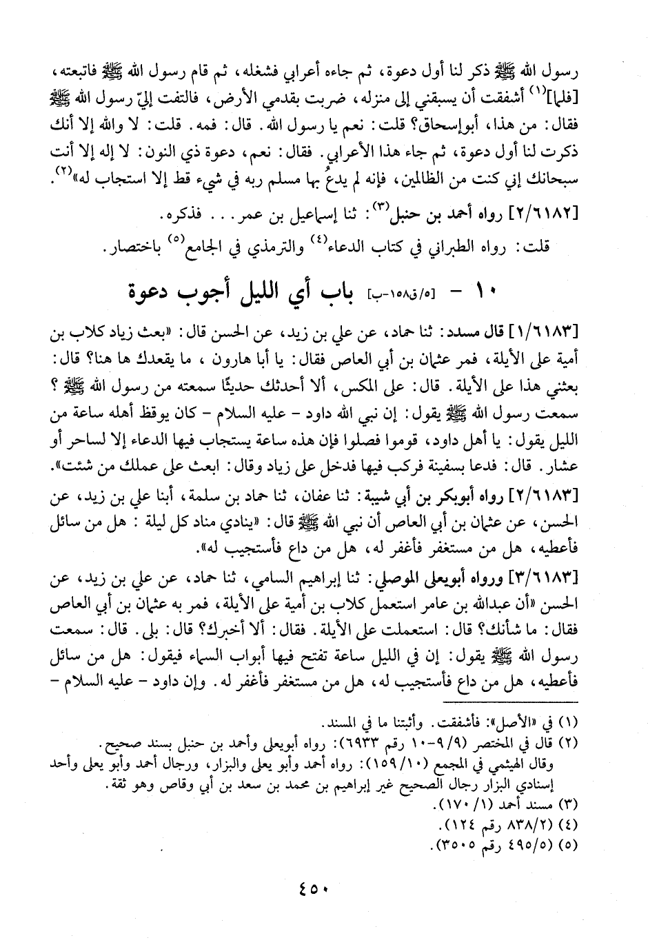 6183 / 2 - رَوَاهُ أَبُو بَكْرِ بْنُ أَبِي شَيْبَةَ: ثنا عفان، ثنا حماد بن سلمة، أبنا عَلِيُّ بْنُ زَيْدٍ، عَنِ الْحَسَنِ، عَنْ عُثْمَانَ بْنِ أَبِي الْعَاصِ أَنَّ نَبِيَّ اللَّهِ - صَلَّى اللَّهُ عَلَيْهِ وَسَلَّمَ - قَالَ: "يُنَادِي مُنَادٍ كُلَّ لَيْلَةٍ: هَلْ مِنْ سَائِلٍ فَأُعْطِيَهُ، هَلْ مِنْ مُسْتَغْفِرٍ فَأَغْفِرَ لَهُ، هَلْ مِنْ دَاعٍ فَأَسْتَجِيبُ له".