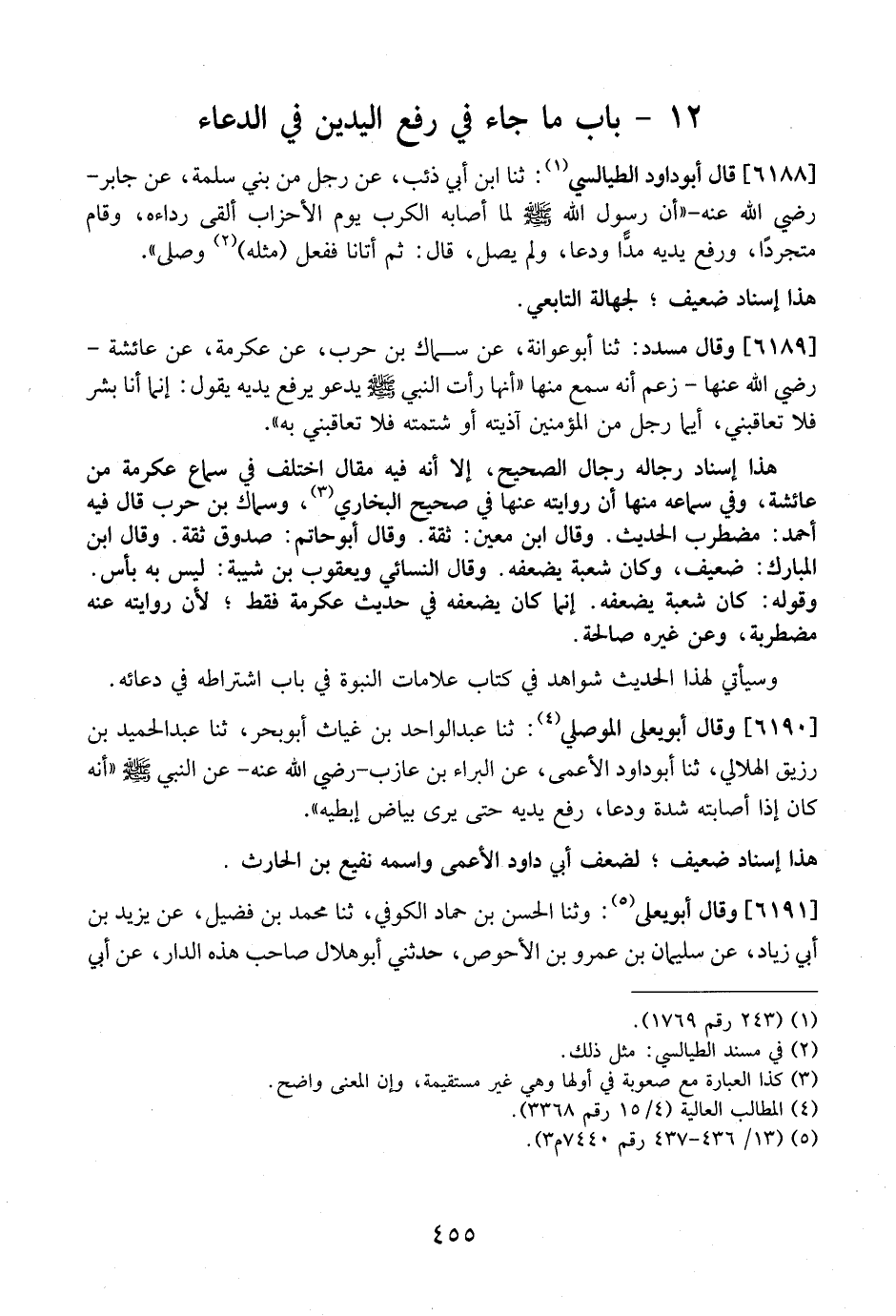 6190 - وَقَالَ أَبُو يَعْلَى الْمَوْصِلِيُّ: ثَنَا عَبْدُ الْوَاحِدِ بْنُ غِيَاثٍ أَبُو بَحْرٍ، ثَنَا عَبْدُ الْحَمِيدِ بن رزيق الْهِلَالِيُّ، ثَنَا أَبُو دَاوُدَ الْأَعْمَى، عَنِ الْبَرَاءِ بْنِ عَازِبٍ- رَضِيَ اللَّهُ عَنْهُ- عَنِ النَّبِيِّ - صَلَّى اللَّهُ عَلَيْهِ وَسَلَّمَ - "أَنَّهُ كَانَ إِذَا أَصَابَتْهُ شِدَّةٌ وَدَعَا، رَفَعَ يَدَيْهِ حَتَّى يُرَى بياض إبطيه".