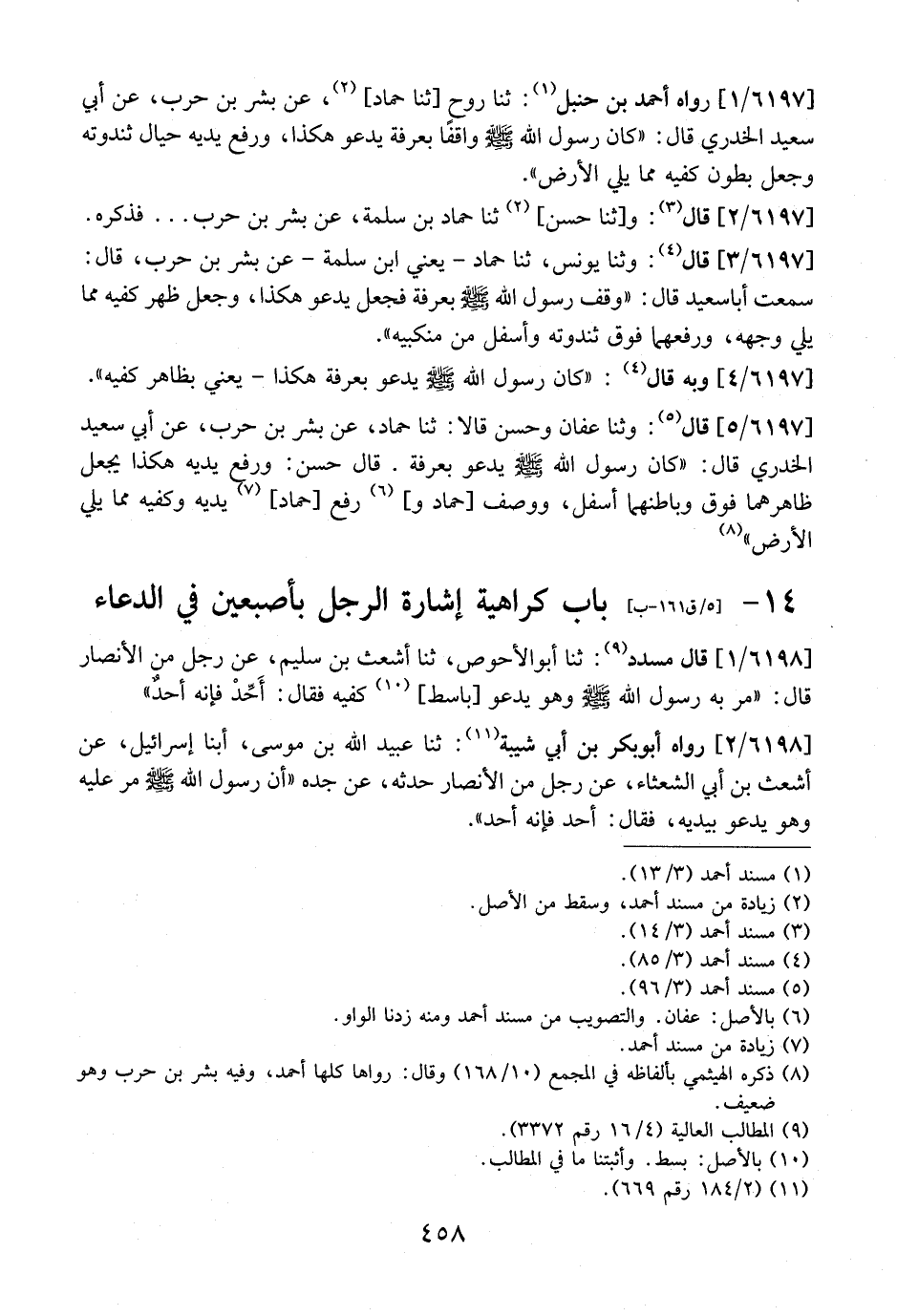6197 / 1 - رواه أحمد بن حنبل: ثنا روح ثَنَا حَمَّادٌ، عَنْ بِشْرُ بْنُ حَرْبٍ، عَنْ أَبِي سَعِيدٍ الْخُدْرِيِّ قَالَ: "كَانَ رَسُولُ اللَّهِ - صَلَّى اللَّهُ عَلَيْهِ وَسَلَّمَ - وَاقِفًا بِعَرَفَةَ يَدْعُو هَكَذَا، وَرَفَعَ يَدَيْهِ حِيَالَ ثُنْدُوَتِهِ وَجَعَلَ بُطُونَ كفيه مما يلي الأرض".