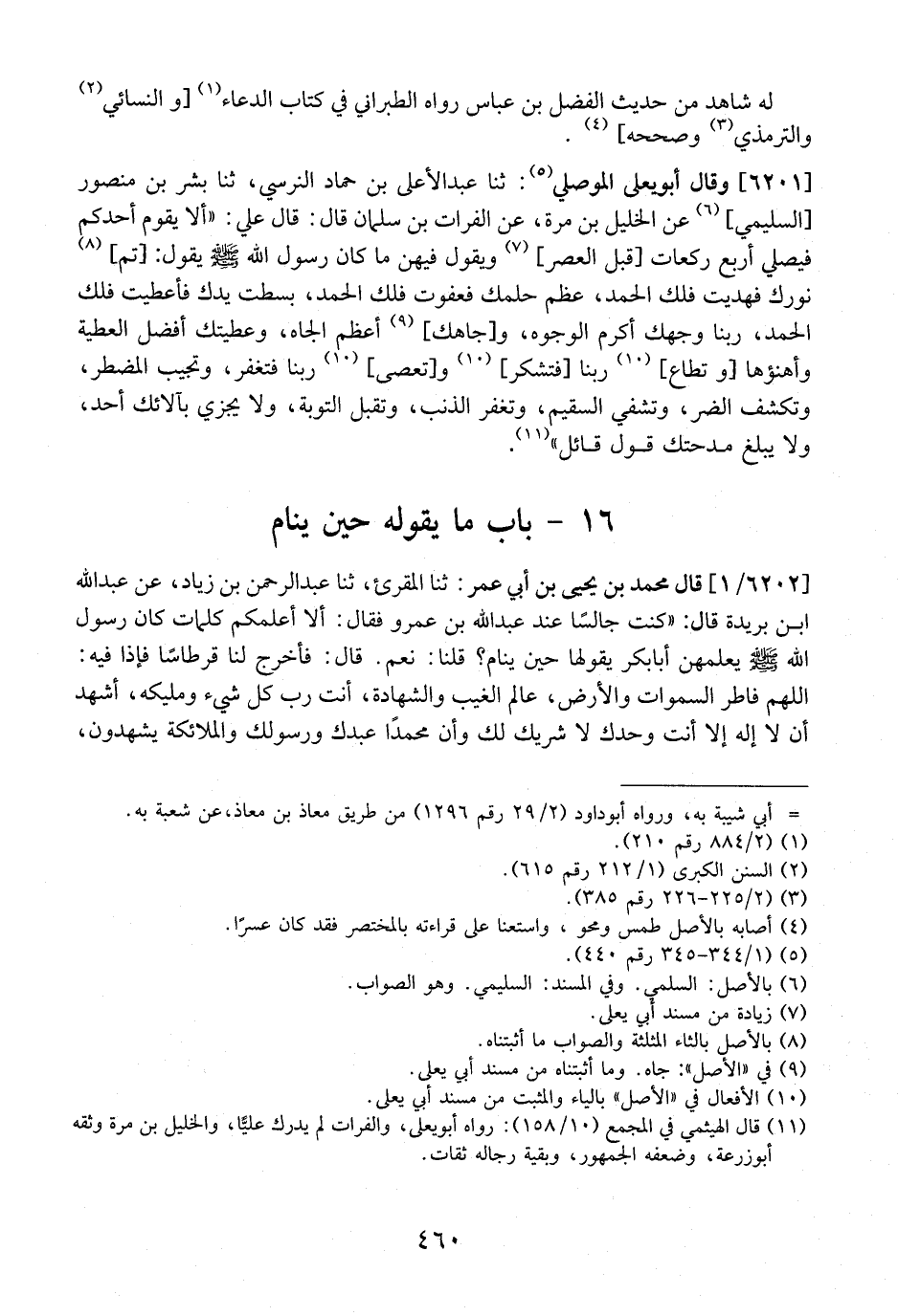 6201 - وَقَالَ أَبُو يَعْلَى الْمَوْصِلِيُّ: ثَنَا عَبْدُ الْأَعْلَى بْنُ حَمَّادٍ النَّرْسِيُّ، ثَنَا بِشْرُ بْنُ مَنْصُورٍ السُّلَيْمِيُّ، عَنِ الْخَلِيلِ بْنِ مُرَّةَ، عَنِ الْفُرَاتِ بن سلمان قَالَ: قَالَ عَلِيٌّ: "أَلَا يَقُومُ أَحَدُكُمْ فَيُصَلِّيَ أَرْبَعَ رَكَعَاتٍ قَبْلَ العصر، وَيَقُولُ فِيهِنَّ مَا كَانَ رَسُولُ اللَّهِ - صَلَّى اللَّهُ عَلَيْهِ وَسَلَّمَ - يَقُولُ: تَمَّ نُورُكَ فَهَدَيْتَ فَلَكَ الْحَمْدُ، عَظُمَ حِلْمُكَ فَعَفَوْتَ فَلَكَ الْحَمْدُ، بَسَطْتَ يَدَكَ فَأَعْطَيْتَ فَلَكَ الْحَمْدُ، رَبَّنَا وَجْهُكَ أَكْرَمُ الْوُجُوهِ، وَجَاهُكَ أَعْظَمُ الْجَاهِ، وَعَطِيَّتُكَ أَفْضَلُ الْعَطِيَّةِ وأهنؤها وتطاع ربنا فتشكر وتعصى ربنا فتغفر، وتجيب الْمُضْطَرَّ، وَتَكْشِفُ الضُّرَّ، وَتَشْفِي السَّقِيمَ، وَتَغْفِرُ الذَّنْبَ، وَتَقْبَلُ التَّوْبَةَ، وَلَا يَجْزِي بِآلَائِكَ أَحَدٌ، وَلَا يَبْلُغُ مَدْحَتَكَ قَوْلُ قَائِلٍ".