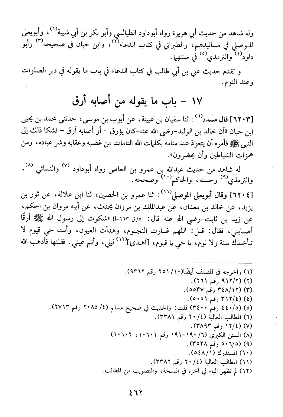 6203 - قَالَ مُسَدَّدٌ: ثَنَا سُفْيَانُ بْنُ عُيَيْنَةَ، عَنْ أُيَّوبَ بْنِ مُوسَى، حَدَّثَنِي مُحَمَّدُ بْنُ يَحْيَى بْنِ حِبَّانَ "أَنَّ خَالِدَ بْنَ الْوَلِيدِ- رَضِيَ اللَّهُ عَنْهُ- كَانَ يُؤَرَّقُ- أَوْ أَصَابَهُ أَرَقٌ- فَشَكَا ذَلِكَ إِلَى النَّبِيَّ - صَلَّى اللَّهُ عَلَيْهِ وَسَلَّمَ - فَأَمَرَهُ أَنْ يَتَعَوَّذَ عِنْدَ مَنَامِهِ بِكَلِمَاتِ اللَّهِ التَّامَّاتِ مِنْ غَضَبِهِ وَعِقَابِهِ وَشَرِّ عِبَادِهِ، وَمِنْ هَمَزَاتِ الشَّيَاطِينِ وَأَنْ يَحْضُرُونَ".