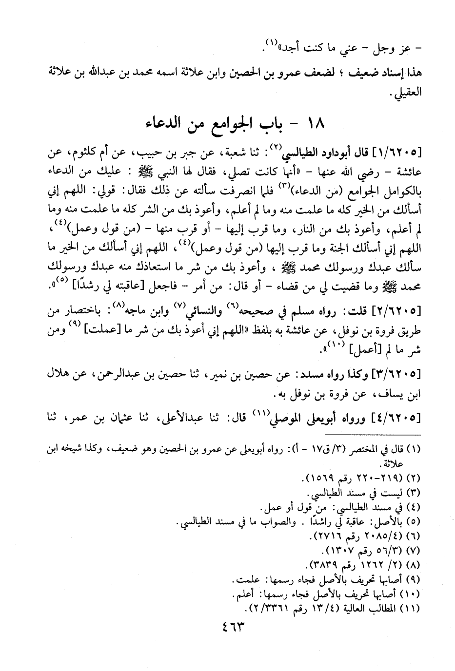 6205 / 1 - قَالَ أَبُو دَاوُدَ الطَّيَالِسِيُّ: ثَنَا شُعْبَةُ، عَنْ جبر بْنِ حَبِيبٍ، عَنْ أُمِّ كُلْثُومٍ، عَنْ عَائِشَةَ- رَضِيَ اللَّهُ عَنْهَا- "أَنَّهَا كَانَتْ تُصَلِّي، فَقَالَ لَهَا النَّبِيُّ - صَلَّى اللَّهُ عَلَيْهِ وَسَلَّمَ -: عَلَيْكِ مِنَ الدُّعَاءِ بِالْكَوَامِلِ الْجَوَامِعِ مِنَ الدُّعَاءِ فَلَمَّا انْصَرَفتَ سَأَلَتْهُ عَنْ ذَلِكَ فَقَالَ: قُولِي: اللَّهُمَّ إِنِّي أَسْأَلُكَ مِنَ الْخَيْرِ كُلِّهِ مَا عَلِمْتُ مِنْهُ وَمَا لَمْ أَعْلَمْ، وَأَعُوذُ بِكَ مِنَ الشَّرِّ كُلِّهِ مَا عَلِمْتُ مِنْهُ وَمَا لَمْ أَعْلَمْ، وَأَعُوذُ بِكَ مِنَ النَّارِ، وَمَا قَرَّبَ إِلَيْهَا- أَوْ قَرَّبَ مِنْهَا- مِنْ قَوْلٍ وَعَمَلٍ، اللَّهُمَّ إِنِّي أَسْأَلُكَ الْجَنَّةَ وَمَا قَرَّبَ إِلَيْهَا مِنْ قَوْلٍ وَعَمَلٍ، اللَّهُمَّ إِنِّي أَسْأَلُكَ مِنَ الْخَيْرِ مَا سَأَلَكَ عَبْدُكَ وَرَسُولُكَ مُحَمَّدٌ - صَلَّى اللَّهُ عَلَيْهِ وَسَلَّمَ -، وَأَعُوذُ بِكَ مِنْ شَرِّ ما استعاذك مِنْهُ عَبْدُكَ وَرَسُولُكَ مُحَمَّدٌ - صَلَّى اللَّهُ عَلَيْهِ وَسَلَّمَ - وَمَا قَضَيْتَ لِي مِنْ قَضَاءٍ- أَوْ قال: من أمر- فاجعل عاقبته لي رشداً".