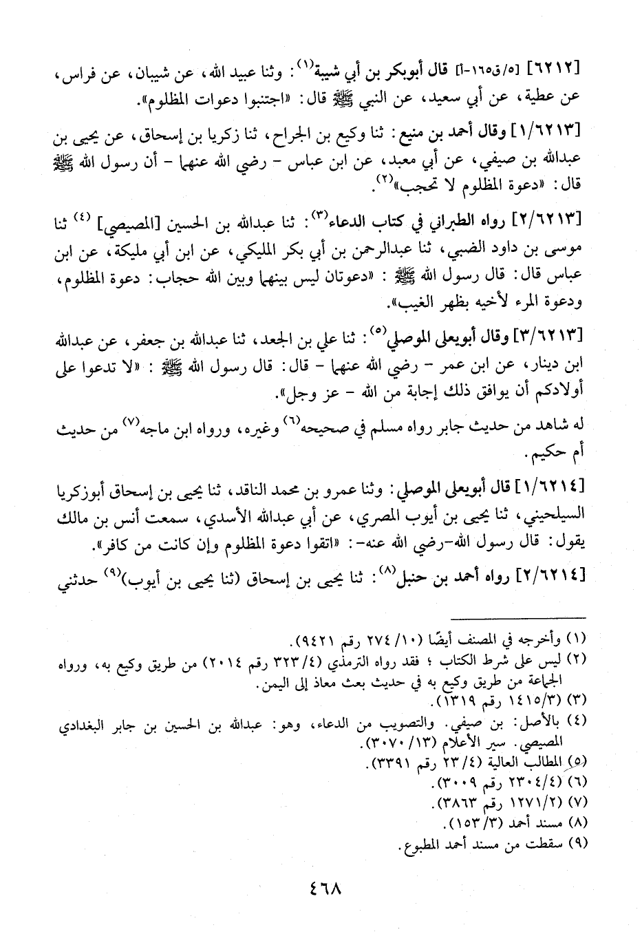 6213 / 1 - وَقَالَ أَحْمَدُ بْنُ مَنِيعٍ: ثَنَا وَكِيعُ بْنُ الْجَرَّاحِ، ثَنَا زَكَرِيَّا بْنُ إِسْحَاقَ، عَنْ يَحْيَى بْنِ عَبْدِ اللَّهِ بْنِ صَيْفِيٍّ، عَنْ أَبِي مَعْبَدٍ، عَنِ ابْنِ عَبَّاسٍ- رَضِيَ اللَّهُ عَنْهُمَا- أَنّ رَسُولَ اللَّهِ - صَلَّى اللَّهُ عليه وَسَلَّمَ - قَالَ: "دَعْوَةُ الْمَظْلُومِ لَا تُحْجَبُ ".