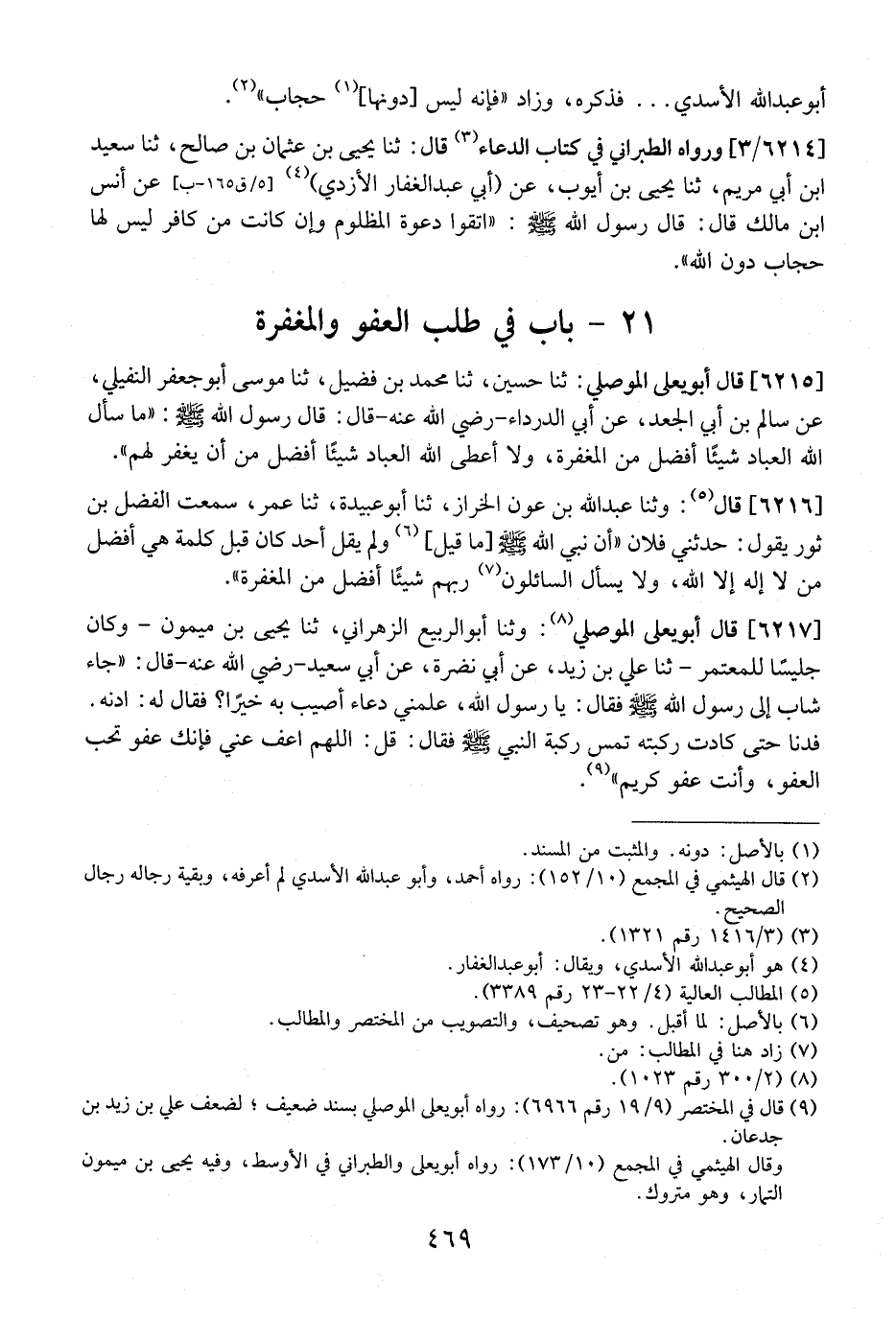 6217 - قَالَ أَبُو يَعْلَى الْمَوْصِلِيُّ: وَثَنَا أَبُو الرَّبِيعِ الزَّهْرَانِيُّ، ثَنَا يَحْيَى بْنُ مَيْمُونٍ- وَكَانَ جَلِيسًا لِلْمُعْتَمِرِ- ثَنَا عِلِيُّ بْنُ زَيْدٍ، عَنْ أَبِي نَضْرَةَ، عَنْ أَبِي سَعِيدٍ- رَضِيَ اللَّهُ عَنْهُ- قَالَ: "جَاءَ شَابٌّ إِلَى رَسُولِ اللَّهِ - صَلَّى اللَّهُ عَلَيْهِ وَسَلَّمَ - فقال: يا رَسُولَ اللَّهِ، عَلِّمْنِي دُعَاءً أُصِيبُ بِهِ خَيْرًا؟ فَقَالَ لَهُ: ادْنُهْ. فَدَنَا حَتَّى كَادَتْ رُكْبَتُهُ تَمَسُّ رُكْبَةَ النَّبِيِّ - صَلَّى اللَّهُ عَلَيْهِ وَسَلَّمَ - فَقَالَ: قُلِ: اللَّهُمَّ اعْفُ عَنِّي فَإِنَّكَ عَفُوٌّ تُحِبُّ الْعَفْوَ، وَأَنْتَ عَفُوٌّ كَرِيمٌ".