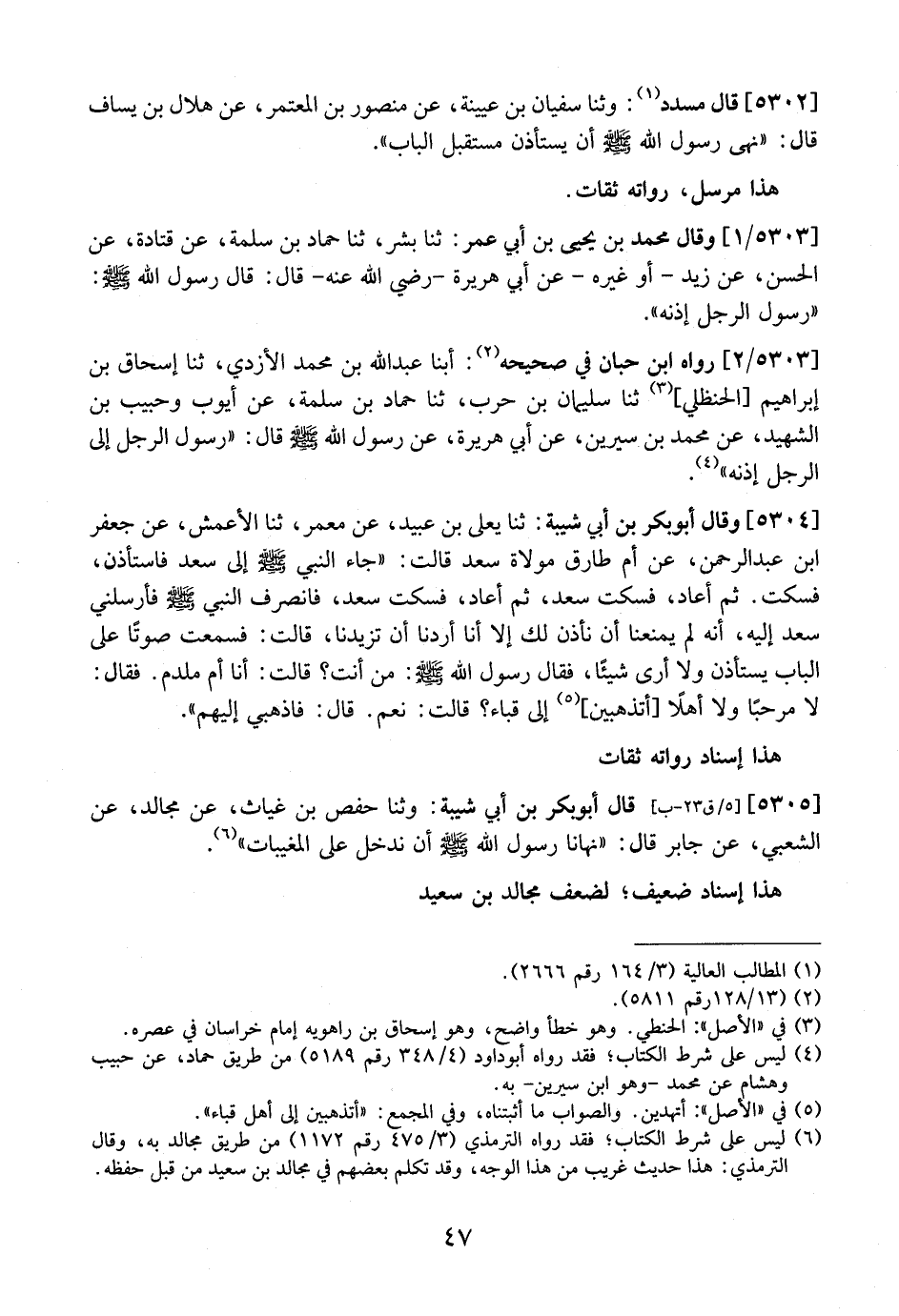 5302 - قَالَ مُسَدَّدٌ: وَثَنَا سُفْيَانُ بْنُ عُيَيْنَةَ، عَنْ مَنْصُورِ بْنِ الْمُعْتَمِرِ، عَنْ هِلَالِ بْنِ يَسَافٍ قَالَ: "نَهَى رَسُولُ اللَّهِ - صَلَّى اللَّهُ عَلَيْهِ وسلم - إن يستأذن مستقبل الباب".