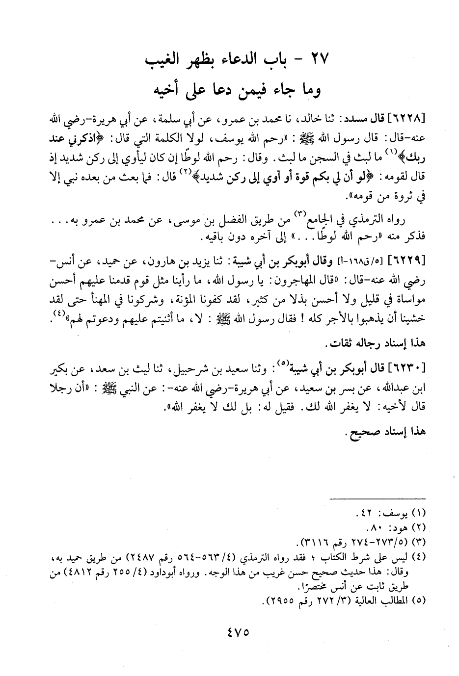 6228 - قال مسدد: ثنا خالد، نا مُحَمَّدِ بْنِ عَمْرٍو، عَنْ أَبِي سَلَمَةَ، عَنْ أَبِي هُرَيْرَةَ- رَضِيَ اللَّهُ عَنْهُ- قَالَ: قَالَ رَسُولُ اللَّهِ - صَلَّى اللَّهُ عَلَيْهِ وَسَلَّمَ -: "رَحِمَ اللَّهُ يُوسُفَ، لَوْلَا الْكَلِمَةُ الَّتِي قَالَ: اذْكُرْنِي عِنْدَ رَبِّكَ مَا لَبِثَ فِي السِّجْنِ مَا لَبِثَ. وَقَالَ: رَحِمَ اللَّهُ لُوطًا إِنْ كَانَ لَيَأْوِي إِلَى رُكْنٍ شَدِيدٍ إِذْ قَالَ لِقَوْمِهِ: (لَوْ أَنَّ لِي بِكُمْ قُوَّةً أَوْ آوِي إِلَى رُكْنٍ شَدِيدٍ) قَالَ: فَمَا بُعِثَ مِنْ بَعْدِهِ نَبِيٌّ إِلَّا فِي ثَرْوَةٍ مِنْ قَوْمِهِ".