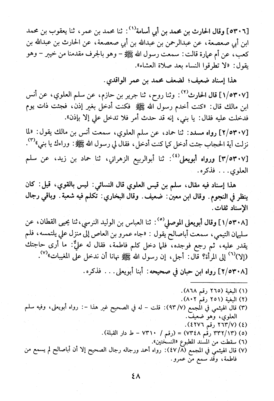 5306 - وَقَالَ الْحَارِثُ بْنُ مُحَمَّدِ بْنِ أَبِي أُسَامَةَ: ثَنَا مُحَمَّدُ بْنُ عُمَرَ، ثَنَا يَعْقُوبُ بْنُ مُحَمَّدِ بْنِ أَبِي صَعْصَعَةَ، عَنْ عَبْدِ الرَّحْمَنِ بْنِ عَبْدِ اللَّهِ بْنِ أَبِي صَعْصَعَةَ، عَنِ الْحَارِثِ بْنِ عَبْدِ اللَّهِ بْنِ كَعْبٍ، عَنْ أُمِّ عُمَارَةَ قَالَتْ: سَمِعْتُ رَسُولَ اللَّهِ - صَلَّى اللَّهُ عَلَيْهِ وَسَلَّمَ - وَهُوَ بِالْجَرْفِ مَقْدِمَنَا مِنْ خَيْبَرَ- وَهُوَ يَقُولُ: "لَا تَطْرُقُوا النِّسَاءَ بَعْدَ صَلَاةِ الْعِشَاءِ".