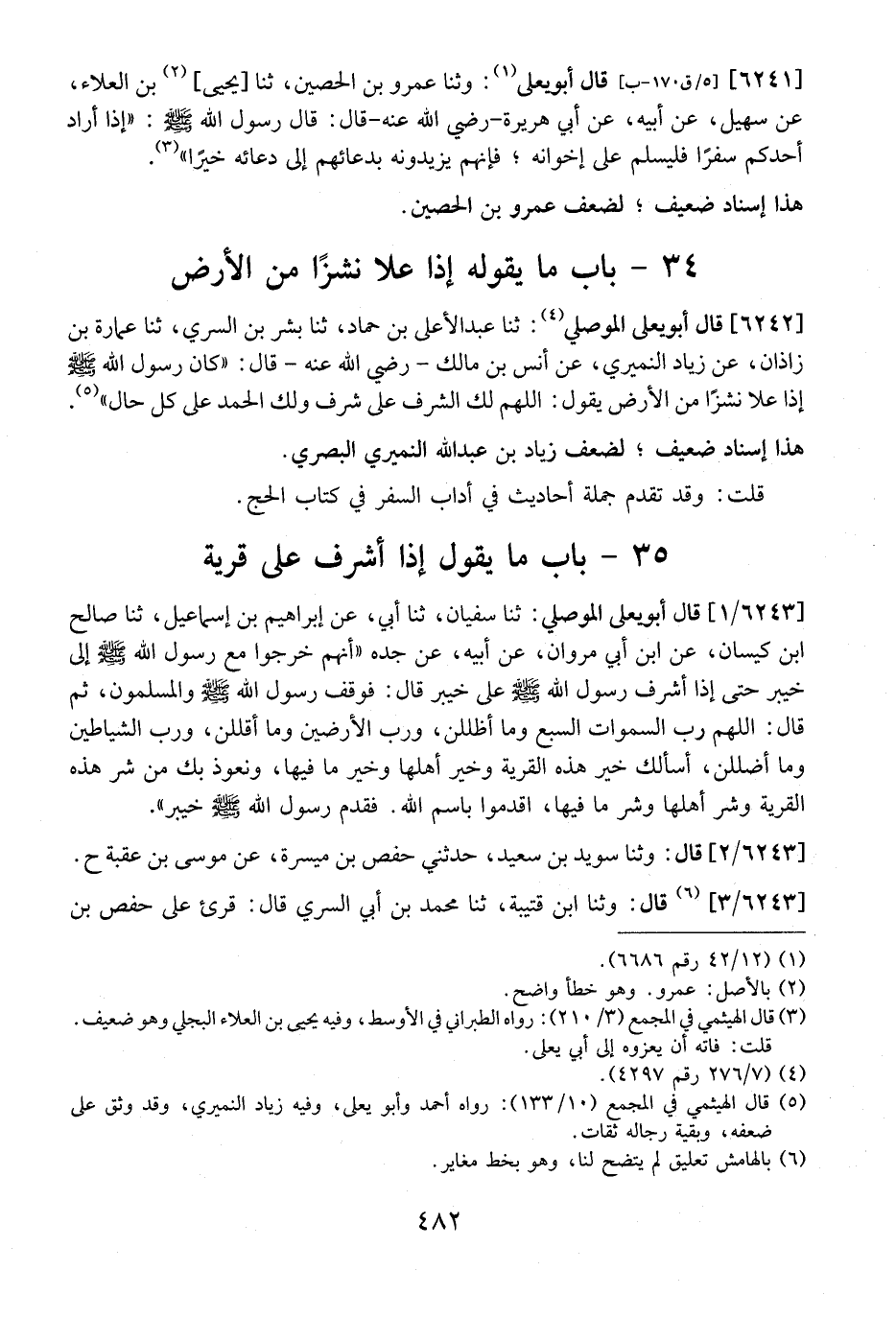 6241 - قال أبو يعلى: وثنا عَمْرُو بْنُ الْحُصَيْنِ، ثنا يَحْيَى بْنُ الْعَلَاءِ، عَنْ سُهَيْلٌ، عَنْ أَبِيهِ، عَنْ أَبِي هُرَيْرَةَ- رَضِيَ اللَّهُ عَنْهُ- قَالَ: قَالَ رَسُولُ اللَّهِ - صَلَّى اللَّهُ عَلَيْهِ وَسَلَّمَ -: "إِذَا أَرَادَ أَحَدُكُمُ سَفَرًا فَلْيُسَلِّمْ عَلَى إِخْوَانهِ؟ فَإِنَّهُمْ يَزِيدُونَهُ بِدُعَائِهِمْ إِلَى دُعَائِهِ خيَراً".