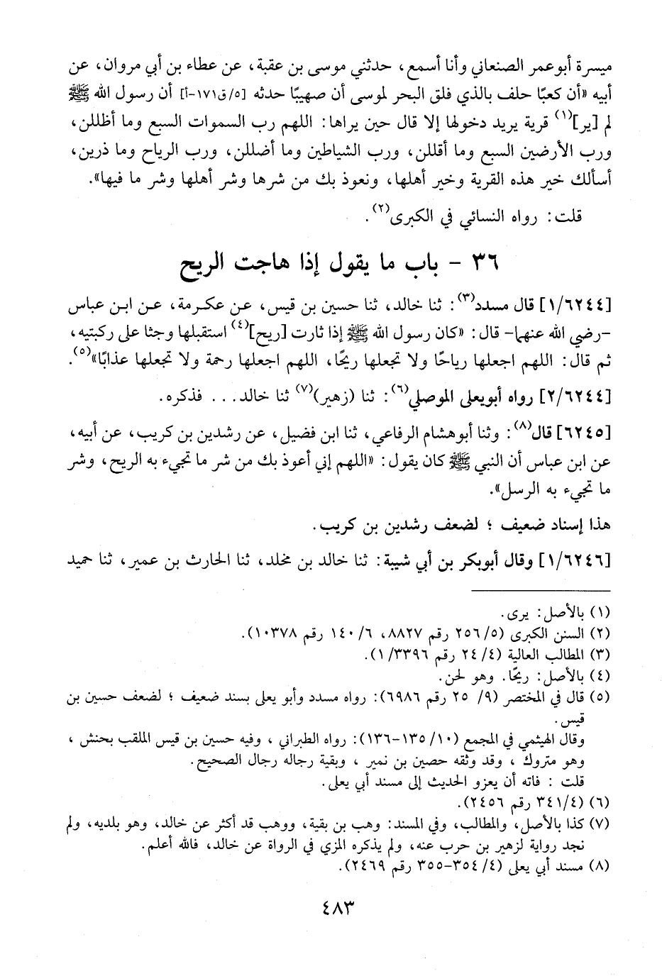 6244 / 1 - قَالَ مُسَدَّدٌ: ثَنَا خَالِدٌ، ثَنَا حُسَيْنُ بْنُ قَيْسٍ، عَنْ عِكْرِمَةَ، عَنِ ابْنِ عَبَّاسٍ - رَضِيَ اللَّهُ عَنْهُمَا- قَالَ: "كَانَ رَسُولُ اللَّهِ - صَلَّى اللَّهُ عَلَيْهِ وَسَلَّمَ - إذا ثَارَتْ رِيحٌ اسْتَقْبَلَهَا وَجَثَا عَلَى رُكْبَتَيْهِ، ثُمَّ قَالَ: اللَّهُمَّ اجْعَلْهَا رِيَاحًا وَلَا تَجْعَلْهَا رِيحًا، اللَّهُمَّ اجْعَلْهَا رَحْمَةً وَلَا تَجْعَلْهَا عَذَابًا".