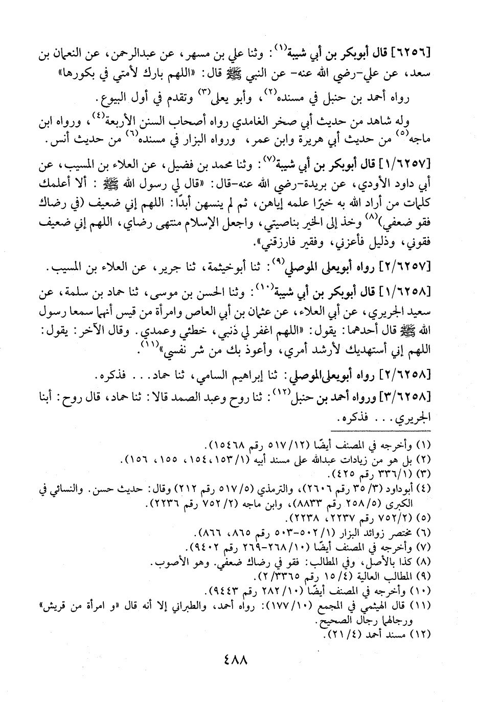 6256 - قَالَ أَبُو بَكْرِ بْنُ أَبِي شَيْبَةَ: وَثَنَا عَلِيُّ بْنُ مُسْهِرٍ، عَنْ عَبْدِ الرَّحْمَنِ، عَنِ النُّعْمَانَ بْنِ سَعْدٍ، عَنْ عَلِيٍّ- رَضِيَ اللَّهُ عَنْهُ- عَنِ النَّبِيِّ - صَلَّى اللَّهُ عَلَيْهِ وَسَلَّمَ - قَالَ: "اللَّهُمَّ بَارِكْ لِأُمَّتِي فِي بُكُورِهَا" رَوَاهُ أحمد بن حنبل في مسنده، وأبو يعلى وتقدم في أول البيوع.
