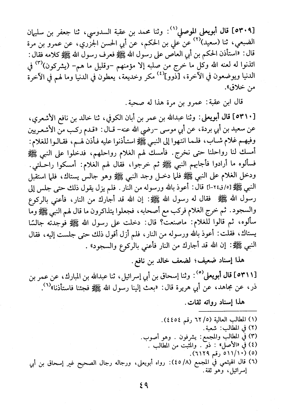 5309 - قَالَ أَبُو يَعْلَى الْمَوْصِلِيُّ: وثنا مُحَمَّدُ بْنُ عُقْبَةَ السَّدُوسِيُّ، ثَنَا جَعْفَرُ بْنُ سُلَيْمَانَ الضُّبَعِيُّ، ثَنَا (سَعِيدٌ) عَنْ عَلِيِّ بْنِ الْحَكَمِ، عَنْ أَبِي الْحَسَنِ الْجَزَرِيِّ، عَنْ عَمْرِو بْنِ مُرَّةَ قَالَ: "اسْتَأْذَنَ الْحَكَمُ بْنُ أَبِي الْعَاصِ عَلَى رَسُولِ اللَّهِ - صَلَّى اللَّهُ عَلَيْهِ وَسَلَّمَ - فَعَرَفَ رَسُولُ اللَّهِ - صَلَّى اللَّهُ عَلَيْهِ وَسَلَّمَ - كَلَامَهُ فَقَالَ: ائْذَنُوا لَهُ لَعَنَهُ اللَّهُ وَكُلَّ مَا خَرَجَ مِنْ صُلْبِهِ إِلَّا مُؤْمِنُهُمْ- وَقَلِيلٌ مَا هُمْ- (يُشْرِكُونَ) فِي الدُّنْيَا وَيُوضَعُونَ فِي الْآخِرَةِ، ذوو مكر وخديعة، يعطون في الدنيا وما لهم فِي الْآخِرَةِ مِنْ خَلَاقٍ".