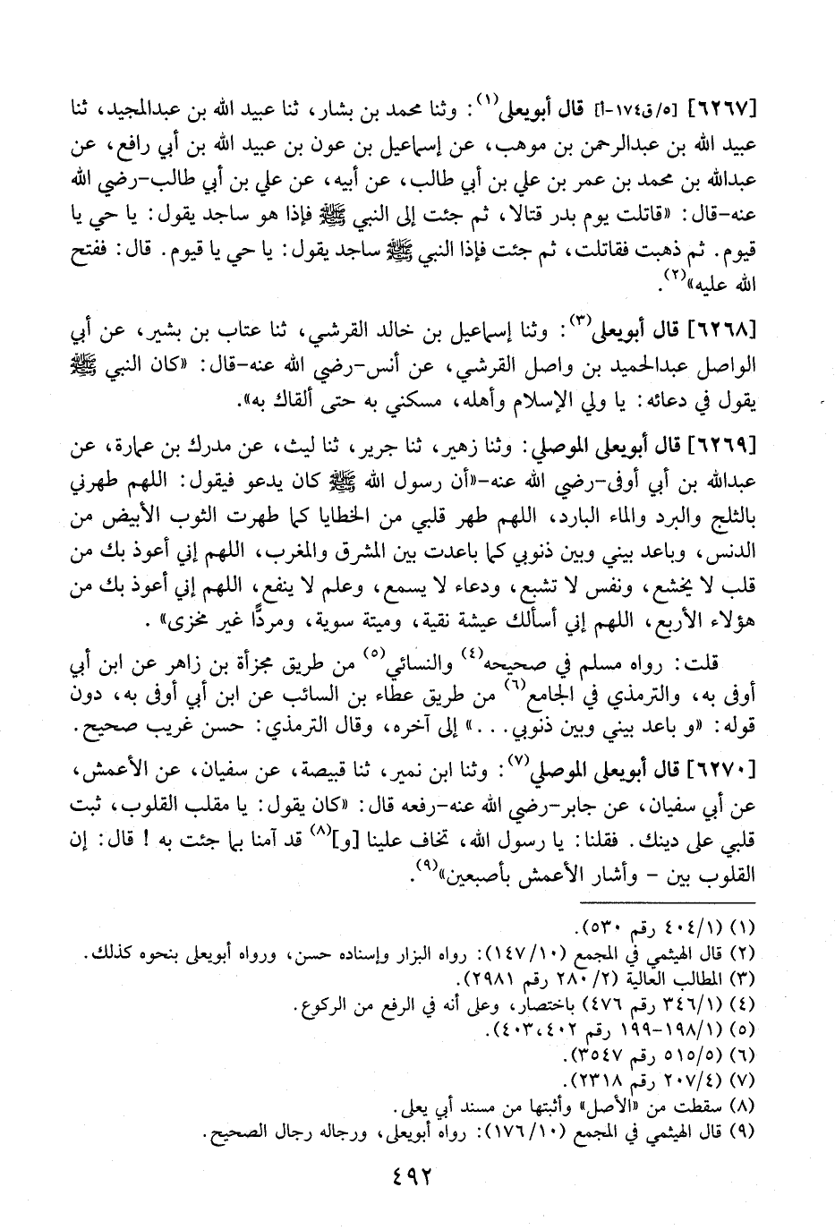 6269 - قَالَ أَبُو يَعْلَى الْمَوْصِلِيُّ: وَثَنَا زُهَيْرٌ، ثَنَا جَرِيرٌ، ثَنَا لَيْثٌ، عَنْ مُدْرِكِ بْنِ عُمَارَةَ، عَنْ عَبْدِ اللَّهِ بْنِ أَبِي أَوْفَى- رَضِيَ اللَّهُ عَنْهُ- "أَنّ رَسُولَ اللَّهِ - صَلَّى اللَّهُ عَلَيْهِ وَسَلَّمَ - كَانَ يَدْعُو فَيَقُولُ: اللَّهُمَّ طَهِّرْنِي بِالثَّلْجِ وَالْبَرَدِ وَالْمَاءِ الْبَارِدِ، اللَّهُمَّ طَهِّرْ قَلْبِي مِنَ الْخَطَايَا كَمَا طَهَّرْتَ الثَّوْبَ الْأَبْيَضَ مِنَ الدَّنَسِ، وَبَاعِدْ بَيْنِي وَبَيْنَ ذُنُوبِي كَمَا بَاعَدْتَ بَيْنَ الْمَشْرِقِ وَالْمَغْرِبِ، اللَّهُمَّ إِنِّي أَعُوذُ بِكَ مِنْ قَلْبٍ لَا يَخْشَعُ، وَنَفْسٍ لَا تَشْبَعُ، وَدُعَاءٍ لَا يُسْمَعُ، وَعِلْمٍ لَا ينفع، اللهم إني أعوذ بك من هؤلاء الْأَرْبَعِ، اللَّهُمَّ إِنِّي أَسْأَلُكَ عِيشَةً نَقِيَّةً، وَمَيْتَةً سَوِيَّةً، وَمَرَدًّا غَيْرَ مُخْزٍى".