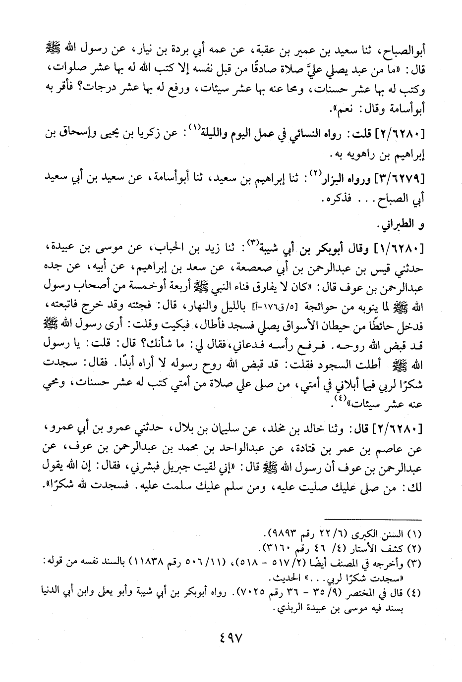 6280 / 1 - وَقَالَ أَبُو بَكْرِ بْنُ أَبِي شَيْبَةَ: ثنا زَيْدُ بْنُ الْحُبَابِ، عَنْ مُوسَى بْنِ عُبَيْدَةَ، حَدَّثَنِي قَيْسُ بْنِ عَبْدِ الرَّحْمَنِ بْنِ أَبِي صَعْصَعَةَ، عَنْ سَعْدِ بْنِ إِبْرَاهِيمَ، عَنْ أَبِيهِ، عَنْ جَدِّهِ عَبْدِ الرَّحْمَنِ بْنِ عَوْفٍ قَالَ: "كان لا يفارق فناء النبي - صلى الله عليه وسلم - أربعة أوخمسة مِنْ أَصْحَابِ رَسُولِ اللَّهِ - صَلَّى اللَّهُ عَلَيْهِ وَسَلَّمَ - لِمَا يَنُوبُهُ مِنْ حَوَائِجِهِ بِاللَّيْلِ وَالنَّهَارِ، قَالَ: فَجِئْتُهُ وَقَدْ خَرَجَ فَاتَّبَعْتُهُ، فَدَخَلَ حَائِطًا مِنْ حِيطَانِ الْأَسْوَاقِ يُصَلِّي فَسَجَدَ فَأَطَالَ، فَبَكَيْتُ وَقُلْتُ: أَرَى رَسُولُ اللَّهِ - صَلَّى اللَّهُ عَلَيْهِ وَسَلَّمَ - قَدْ قَبَضَ اللَّهُ رُوحَهُ. فَرَفَعَ رَأْسَهُ فَدَعَانِي، فَقَالَ لِي: مَا شَأْنُكَ؟ قَالَ: قُلْتُ: يَا رَسُولَ اللَّهِ - صَلَّى اللَّهُ عَلَيْهِ وَسَلَّمَ - أَطَلْتَ السُّجُودَ فَقُلْتُ: قَدْ قَبَضَ اللَّهُ رُوحَ رَسُولِهِ لَا أَرَاهُ أَبَدًا. فَقَالَ: سَجَدْتُ شُكْرًا لِرَبِّي فِيمَا أَبْلَانِي فِي أُمَّتِي، مَنْ صَلَّى عَلَيَّ صَلَاةً مِنْ أُمَّتِي كُتِبَ لَهُ عَشْرُ حَسَنَاتٍ، وَمُحِيَ عَنْهُ عَشْرُ سَيِّئَاتٍ".