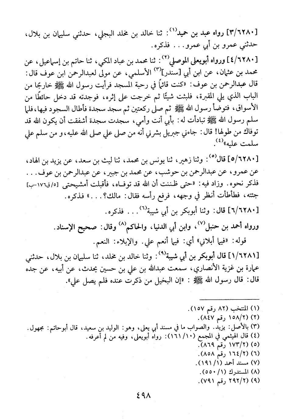 6280 / 4 - وَرَوَاهُ أَبُو يَعْلَى الْمَوْصِلِيُّ: ثَنَا مُحَمَّدُ بْنُ عباد المكي، ثَنَا حَاتِمُ بْنُ إِسْمَاعِيلَ، عَنْ مُحَمَّدِ بْنِ عثمان، عن ابن أبي سندر الْأَسْلَمِيِّ، عَنْ مَولًى لِعَبْدِ الرَّحْمَنِ بْنِ عَوْفٍ قَالَ: قَالَ عَبْدُ الرَّحْمَنِ بْنُ عَوْفٍ: "كُنْتُ قائما في رحبة المسجد فَرَأَيْتُ رَسُولَ اللَّهِ - صَلَّى اللَّهُ عَلَيْهِ وَسَلَّمَ - خَارِجًا مِنَ الْبَابِ الذي يلي المقبرة، فلبثت شيئا ثم خرجت على أثره، فوجدته قد دخل حائطا من الْأَسْوَاقِ، فَتَوَضَّأَ رَسُولُ اللَّهِ - صَلَّى اللَّهُ عَلَيْهِ وَسَلَّمَ - ثُمَّ صَلَّى رَكْعَتَيْنِ ثُمَّ سَجَدَ سَجْدَةً فَأَطَالَ السُّجُودَ فِيهَا، فَلَمَّا سَلَّمَ رَسُولُ اللَّهِ - صَلَّى اللَّهُ عَلَيْهِ وَسَلَّمَ - تَبَادَأْتُ لَهُ: بِأَبِي أَنْتَ وَأُمِّي، سَجَدْتَ سَجْدَةً أَشْفَقْتُ أَنْ يَكُونَ الله قد توفاك من طولها! قال: جاءني جِبْرِيلُ بَشَّرَنِي أَنَّهُ مَنْ صَلَّى عَلَيَّ صَلَّى الله عليه، ومن سَلَّمَ عَلَيَّ سَلَّمْتُ عَلَيْهِ".