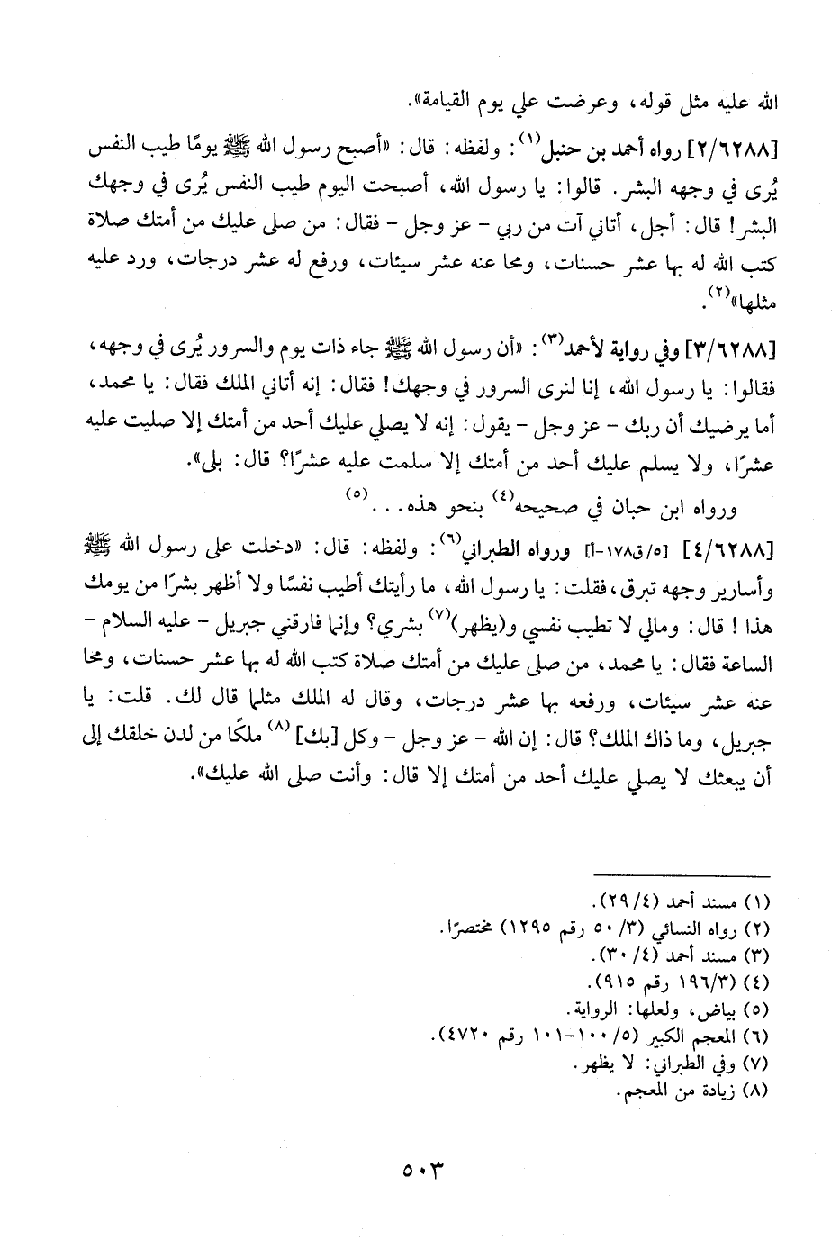 6288 / 2 - رَوَاهُ أَحْمَدُ بْنُ حَنْبَلٍ: وَلَفْظُهُ: قَالَ: "أَصْبَحَ رَسُولِ اللَّهِ - صَلَّى اللَّهُ عَلَيْهِ وَسَلَّمَ - يَوْمًا طَيِّبَ النَّفْسِ يُرى فِي وَجْهِهِ الْبِشْرُ. قَالُوا: يَا رَسُولَ اللَّهِ، أَصْبَحْتَ الْيَوْمَ طَيِّبَ النفس يُرى في وجهك البشر! قَالَ: أَجَلْ، أَتَانِي آتٍ مِنْ رِبِّي- عَزَّ وَجَلَّ- فَقَالَ: مَنْ صَلَّى عَلَيْكَ مِنْ أُمَّتِكَ صَلَاةً كَتَبَ اللَّهُ لَهُ بِهَا عَشْرَ حَسَنَاتٍ، ومحا عَنْهُ عَشْرُ سَيِّئَاتٍ، وَرُفِعَ لَهُ عَشْرُ دَرَجَاتٍ، ورد عليه مثلها".