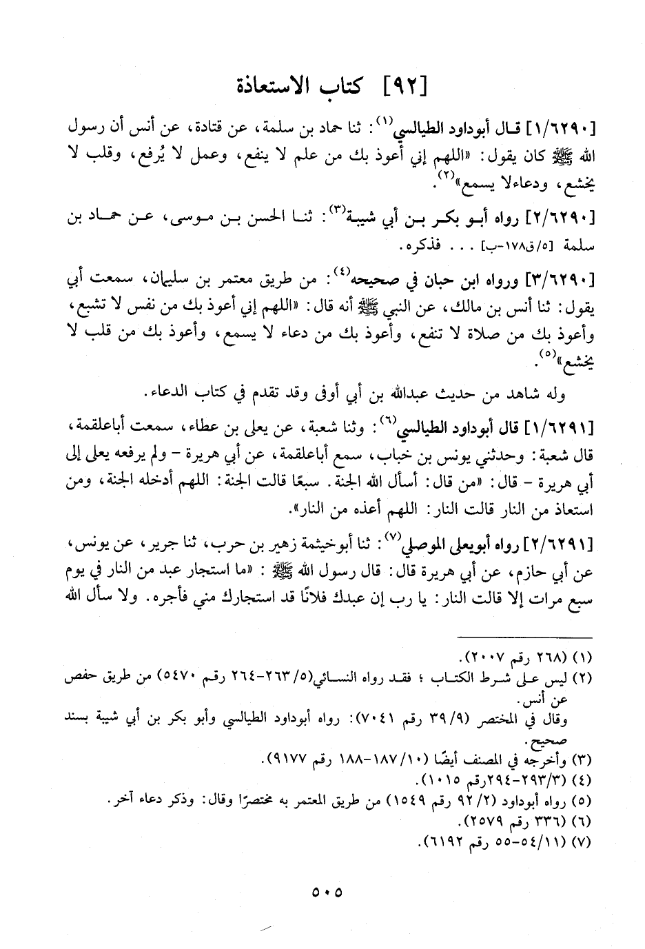 6290 / 1 - قَالَ أَبُو دَاوُدَ الطَّيَالِسِيُّ: ثَنَا حَمَّادُ بْنُ سَلَمَةَ، عَنْ قَتَادَةَ، عَنْ أَنَسٍ أَنّ رَسُولَ اللَّهِ - صَلَّى اللَّهُ عَلَيْهِ وَسَلَّمَ - كَانَ يَقُولُ: "اللَّهُمَّ إني أعوذ بك من عِلْمٍ لَا يَنْفَعُ، وَعَمَلٍ لَا يُرفع، وَقَلْبٍ لَا يَخْشَعُ، وَدُعَاءٍ لَا يُسْمَعُ".