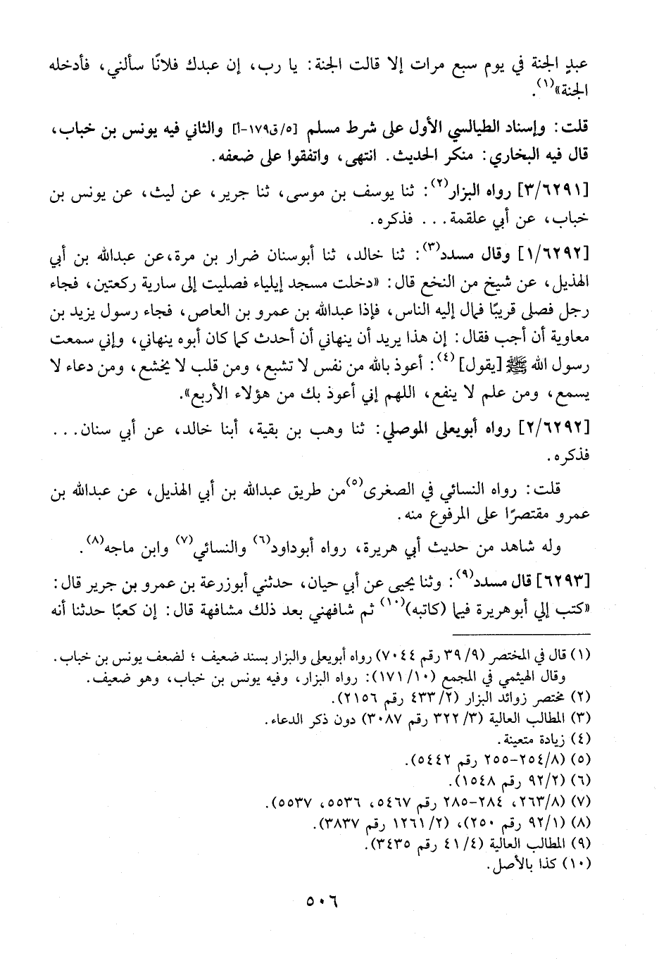[6292/] وَقَالَ مُسَدَّدٌ: ثَنَا خالد، ثنا أبو منان ضِرَارُ بْنُ مُرَّةَ، عَنْ عَبْدِ اللَّهِ بْنِ أَبِي الْهُذَيْلِ، عَنْ شَيْخٍ مِنَ النَّخَعِ قَالَ: "دَخَلْتُ مَسْجِدَ إِيلْيَاءَ فَصَلَّيْتُ إِلَى سَارِيَةٍ رَكْعَتَيْنِ، فَجَاءَ رَجُلٌ فَصَلَّى قَرِيبًا فَمَالَ إِلَيْهِ النَّاسُ، فَإِذَا عَبْدُ اللَّهِ بْنُ عَمْرِو بْنِ الْعَاصِ، فَجَاءَ رَسُولُ يَزِيدَ بْنِ مَعَاوِيَةَ أَنْ أَجِبْ فَقَالَ: إِنَّ هَذَا يُرِيدُ أَنْ يَنْهَانِي أَنْ أُحَدِّثَ كَمَا كَانَ أَبُوهُ يَنْهَانِي، وَإِنِّي سَمِعْتُ رَسُولَ اللَّهِ - صَلَّى اللَّهُ عَلَيْهِ وسلم - يقول: أَعُوذُ بِاللَّهِ مِنْ نَفْسٍ لَا تَشْبَعُ، وَمِنْ قَلْبٍ لَا يَخْشَعُ، وَمِنْ دُعَاءٍ لَا يُسْمَعُ، وَمِنْ عِلْمٍ لَا يَنْفَعُ، اللَّهُمَّ إِنِّي أَعُوذُ بِكَ مِنْ هَؤُلَاءِ الْأَرْبَعِ".