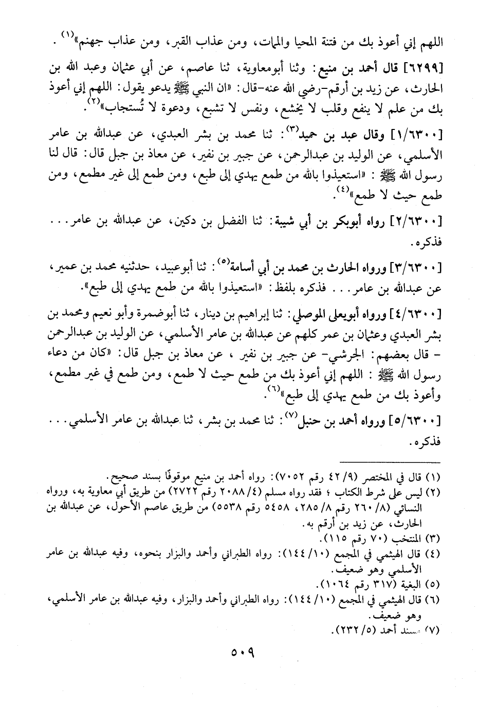 6299 - قَالَ أَحْمَدُ بْنُ مَنِيعٍ: وَثَنَا أَبُو مَعَاوِيَةَ، ثَنَا عَاصِمٌ، عَنْ أَبِي عُثْمَانَ وَعَبْدِ اللَّهِ بْنِ الْحَارِثِ، عَنْ زَيْدِ بْنِ أَرْقَمَ- رَضِيَ اللَّهُ عَنْهُ- قَالَ: "إِنَّ النَّبِيَّ - صَلَّى اللَّهُ عَلَيْهِ وَسَلَّمَ - يَدْعُو يَقُولُ: اللَّهُمَّ إِنِّي أَعُوذُ بِكَ مِنْ عِلْمٍ لَا يَنْفَعُ وَقَلْبٍ لَا يَخْشَعُ، وَنَفْسٍ لَا تَشْبَعُ، ودعوة لا تُستجاب".