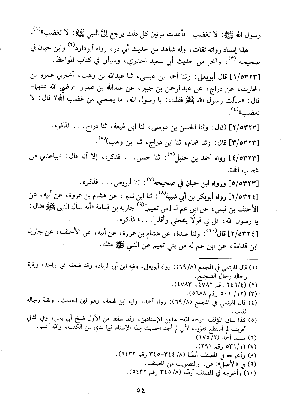 رسول الله: لَا تَغْضَبْ. فَأَعَدْتُ مَرَّتَيْنِ كُلَّ ذَلِكَ يَرْجِعُ إليَّ النَّبِيِّ - صَلَّى اللَّهُ عَلَيْهِ وَسَلَّمَ -: لَا تغضب". هَذَا إِسْنَادٌ رُوَاتُهُ ثِقَاتٌ، وَلَهُ شَاهِدٌ مِنْ حَدِيثِ أَبِي ذَرٍّ، رَوَاهُ أَبُو دَاوُدَ وَابْنُ حِبَّانَ في صحيحه، وآخر مِنْ حَدِيثِ أَبِي سَعِيدٍ الْخُدْرِيِّ، وَسَيَأْتِي فِي كتاب المواعظ.