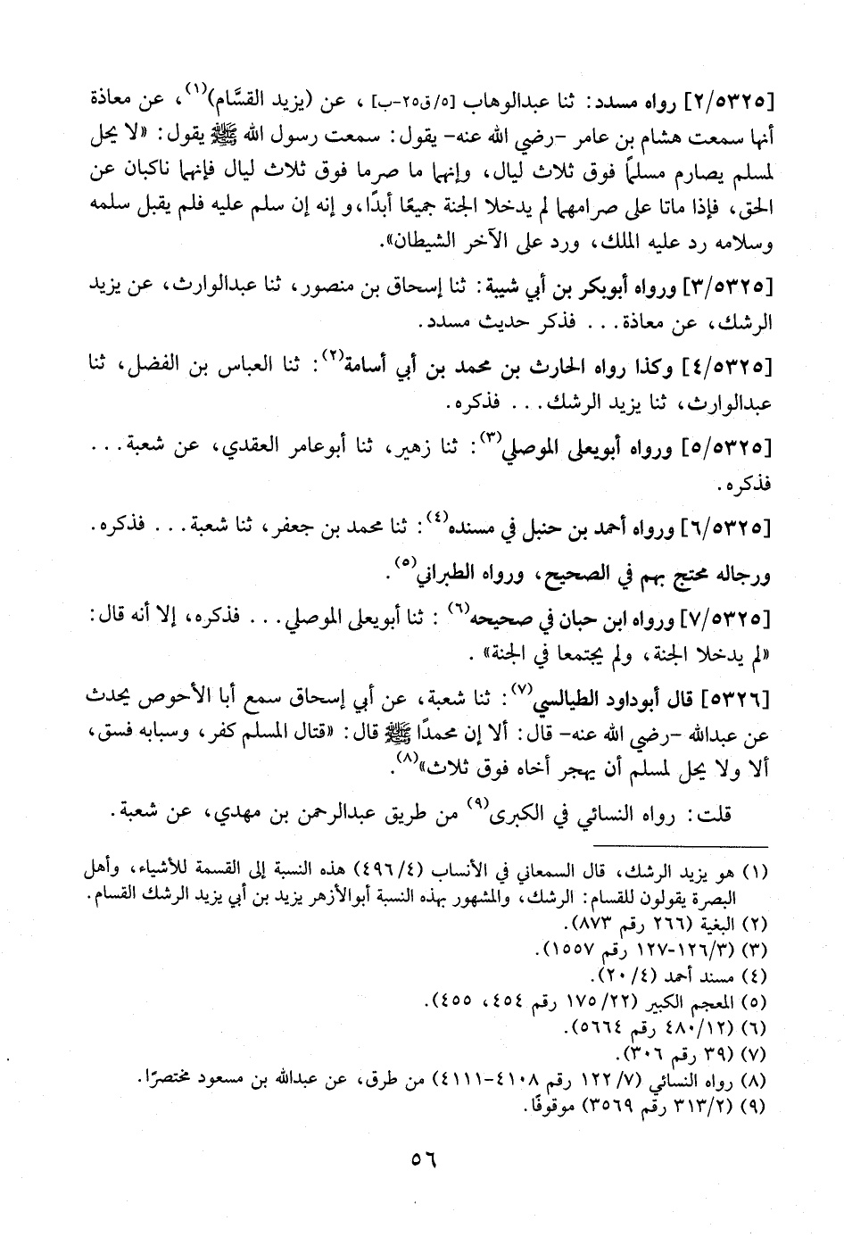5325 / 2 - رَوَاهُ مُسَدَّدٌ: ثَنَا عَبْدُ الْوَهَّابِ عَنْ (يَزِيدَ القسَّام) ، عَنْ مُعَاذَةَ أَنَّهَا سَمِعَتْ هِشَامَ بْنَ عَامِرٍ- رَضِيَ اللَّهُ عَنْهُ- يَقُولُ: سَمِعْتُ رَسُولَ اللَّهِ - صَلَّى اللَّهُ عَلَيْهِ وَسَلَّمَ - يَقُولُ: "لَا يَحِلُّ لِمْسُلِمٍ يُصَارِمُ مُسْلِمًا فَوْقَ ثَلَاثِ لَيَالٍ، وَأَنَّهُمَا مَا صَرَمَا فَوْقَ ثَلَاثِ لَيَالٍ فَإِنَّهُمَا نَاكِبَانِ عَنِ الْحَقِّ، فَإِذَا مَاتَا عَلَى صِرَامِهِمَا لَمْ يدخلا الجنة جميعاً أبداً، وإنه إن سلم عليه فلم يقبل سلمه وَسَلَامَهُ رَدَّ عَلَيْهِ الْمَلَكُ، وَرَدَّ عَلَى الْآخَرِ الشَّيْطَانُ".