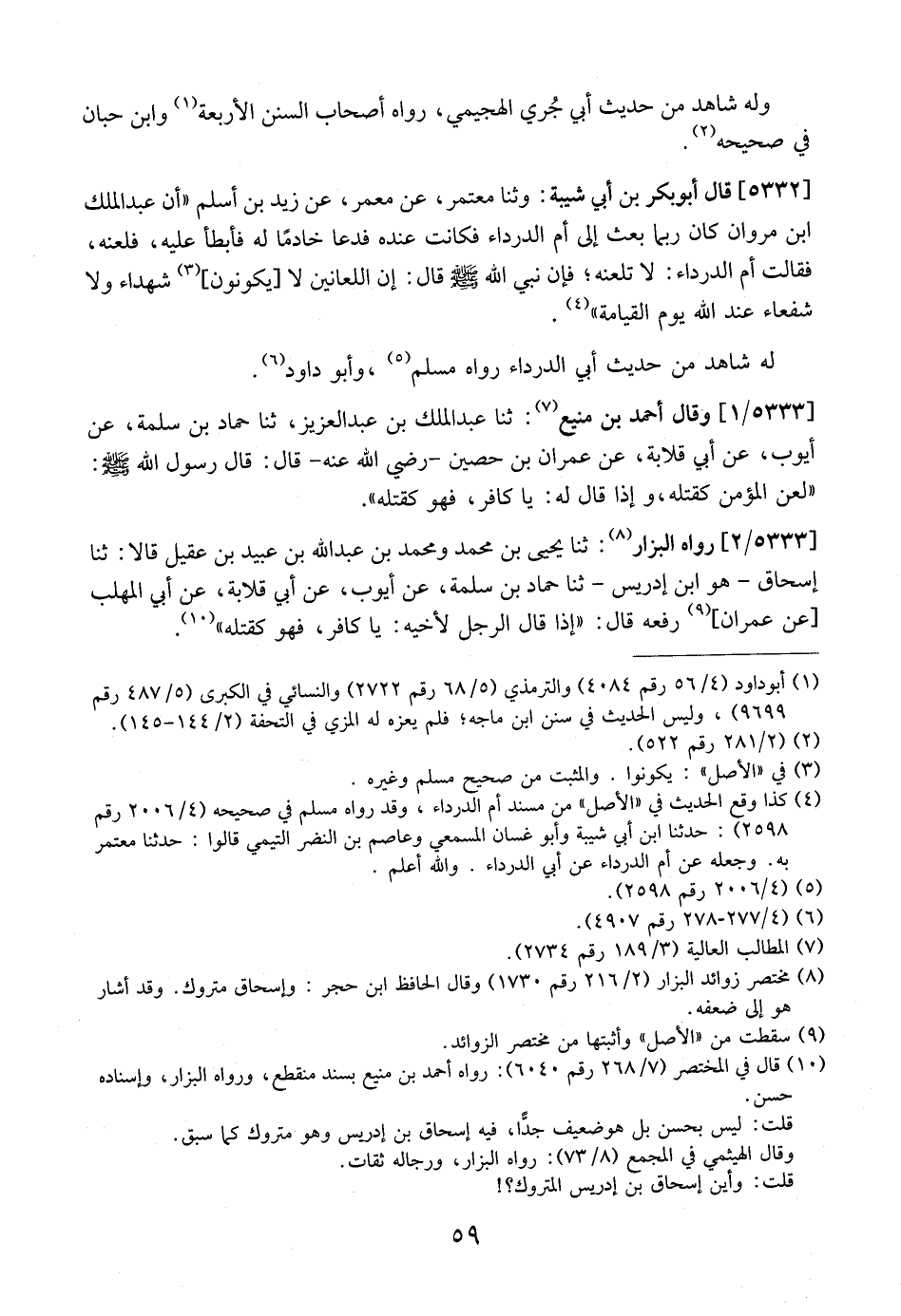5333 / 2 - رَوَاهُ الْبَزَّارُ: ثَنَا يَحْيَى بْنُ مُحَمَّدٍ وَمُحَمَّدُ بْنُ عَبْدِ اللَّهِ بْنِ عُبَيْدِ بْنِ عُقَيْلٍ قَالَا: ثَنَا إسحق - هُوَ ابْنُ إِدْرِيسَ- ثَنَا حَمَّادُ بْنُ سَلَمَةَ، عَنْ أَيُّوبَ، عَنْ أَبِي قِلَابَةَ، عَنْ أَبِي المهلب عن عمران رَفَعَهُ قَالَ: "إِذَا قَالَ الرَّجُلُ لِأَخِيهِ: يَا كَافِرُ، فَهُوَ كَقَتْلِهِ".