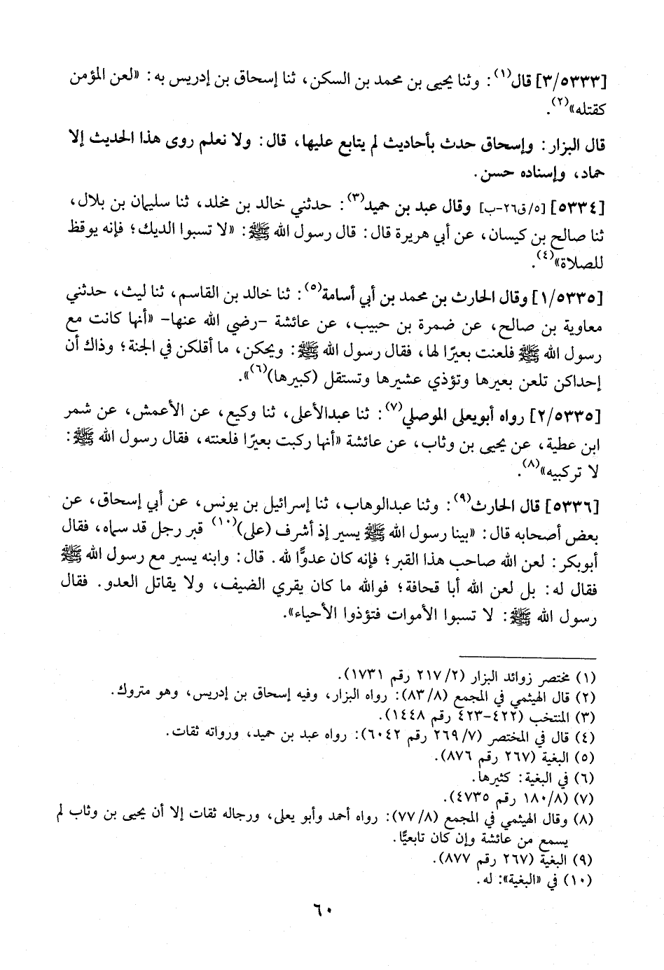5335 / 1 - وَقَالَ الْحَارِثُ بْنُ مُحَمَّدِ بْنِ أَبِي أُسَامَةَ: ثَنَا خَالِدُ بْنُ الْقَاسِمِ، ثَنَا لَيْثٌ، حَدَّثَنِي مُعَاوِيَةُ بْنُ صَالِحٍ، عَنْ ضَمْرَةَ بْنِ حَبِيبٍ عَنْ عَائِشَةَ- رَضِيَ اللَّهُ عَنْهَا- "أَنَّهَا كَانَتْ مَعَ رَسُولِ اللَّهِ - صَلَّى اللَّهُ عَلَيْهِ وَسَلَّمَ - فَلَعَنَتْ بَعِيرًا لَهَا، فَقَالَ رَسُولُ اللَّهِ صَلَّى اللَّهُ عَلَيْهِ وَسَلَّمَ: وَيْحَكُنَّ، مَا أَقَلَّكُنَّ فِي الْجَنَّةِ، وَذَاكَ أَنَّ إِحْدَاكُنَّ تَلْعَنُ بَعِيرَهَا وَتُؤْذِي عَشِيرَهَا وتستقل كبيرها".