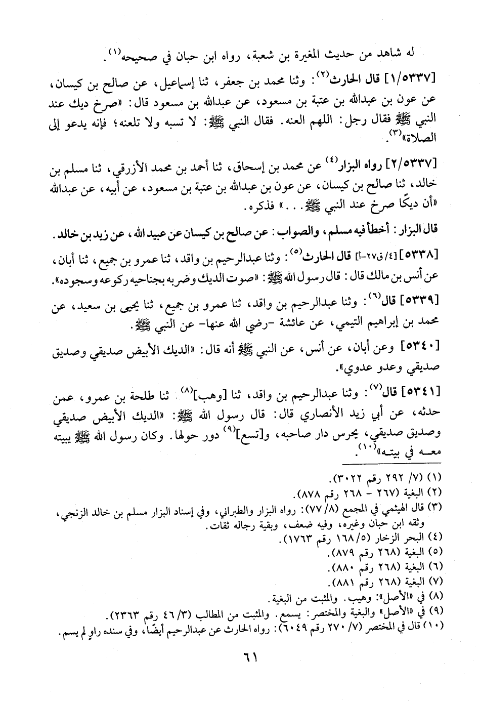 5337 / 1 - قَالَ الْحَارِثُ: وَثَنَا مُحَمَّدُ بْنُ جَعْفَرٍ، ثَنَا إِسْمَاعِيلُ، عَنْ صالح بن كيسان، عَنْ عَوْنِ بْنِ عَبْدِ اللَّهِ بْنِ عُتْبَةَ بْنِ مَسْعُودٍ، عَنْ عَبْدِ اللَّهِ بْنِ مَسْعُودٍ قَالَ: "صَرَخَ دِيكٌ عِنْدَ النَّبِيِّ - صَلَّى اللَّهُ عَلَيْهِ وَسَلَّمَ - فَقَالَ رَجُلٌ: اللَّهُمَّ الْعَنْهُ. فَقَالَ النَّبِيُّ - صَلَّى اللَّهُ عَلَيْهِ وَسَلَّمَ -: لَا تَسُبَّهُ وَلَا تَلْعَنْهُ؟ فَإِنَّهُ يَدْعُو إِلَى الصَّلَاةِ".