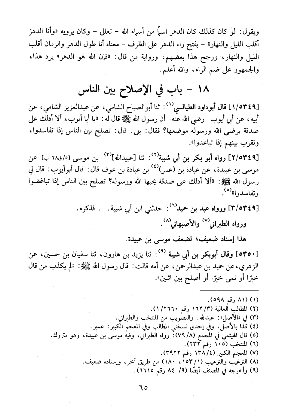 5349 / 2 - رَوَاهُ أَبُو بَكْرِ بْنُ أَبِي شَيْبَةَ: ثَنَا عُبَيْدُ اللَّهِ بْنُ مُوسَى عَنْ مُوسَى بْنِ عُبَيْدَةَ، عَنْ عُبَادَةَ بْنِ عُمَرَ بْنِ عبادة بن عوف قال: قَالَ أَبُو أَيُّوبَ: قَالَ لِي رَسُولُ اللَّهِ - صَلَّى اللَّهُ عَلَيْهِ وَسَلَّمَ -: "أَلَا أَدُلُّكَ عَلَى صَدَقَةٍ يُحِبُّهَا اللَّهُ وَرَسُولُهُ؟ تُصْلِحُ بَيْنَ النَّاسِ إذا تباغضوا وتفا سدوا".