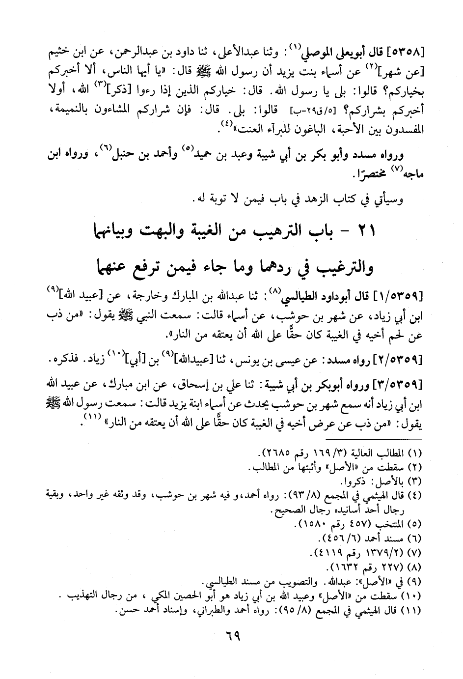 5358 - قَالَ أَبُو يَعْلَى الْمَوْصِلِيُّ: وَثَنَا عَبْدُ الْأَعْلَى، ثَنَا دَاوُدُ بْنُ عَبْدِ الرَّحْمَنِ، عَنِ ابْنِ خثيم عن شهر، عَنْ أَسْمَاءَ بِنْتِ يَزِيدَ أَنَّ رَسُولَ اللَّهِ - صَلَّى اللَّهُ عَلَيْهِ وسلم - قال: "يا أَيُّهَا النَّاسُ، أَلَا أُخْبِرُكُمْ بِخِيَارِكُمْ؟ قَالُوا: بَلَى يَا رَسُولَ اللَّهِ. قَالَ: خِيَارُكُمُ الَّذِينَ إِذَا رؤوا ذُكِرَ اللَّهُ، أَوَلَا أُخْبِرُكُمْ بِشِرَارِكُمْ؟ قَالُوا: بَلَى. قَالَ: فَإِنَّ شِرَارَكُمُ الْمَشَّاءُونَ بِالنَّمِيمَةِ، الْمُفْسِدُونَ بَيْنَ الأحبة، الباغون للبرآء العنت".