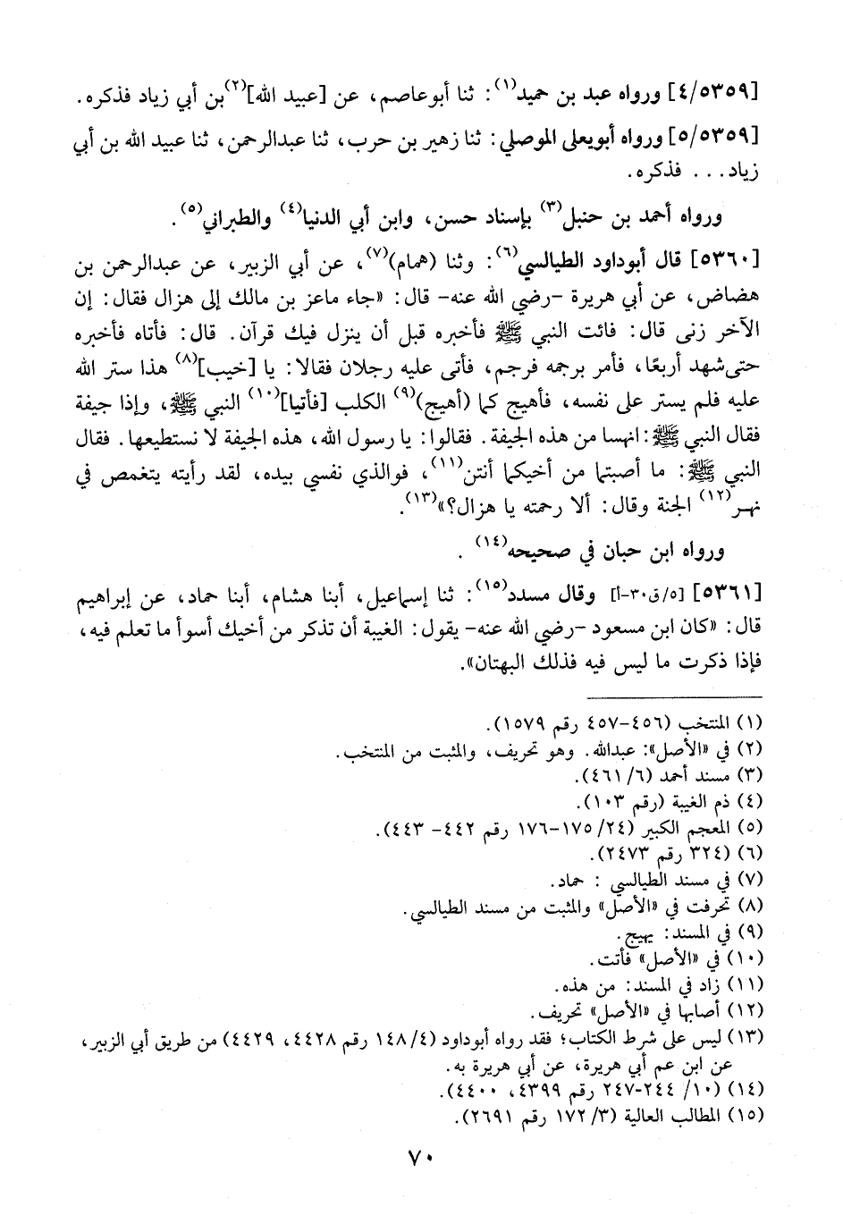 5361 - وَقَالَ مسدد: ثنا إسماعيل، أبنا هشام، أبنا حَمَّادٌ، عَنْ إِبْرَاهِيمَ قَالَ: "كَانَ ابْنُ مَسْعُودٍ- رَضِيَ اللَّهُ عَنْهُ- يَقُولُ: الْغِيبَةُ أَنْ تَذْكُرَ مِنْ أَخِيكَ أَسْوَأَ مَا تَعْلَمُ فِيهِ، فَإِذَا ذَكَرْتَ مَا لَيْسَ فِيهِ فَذَلِكَ الْبُهْتَانُ".