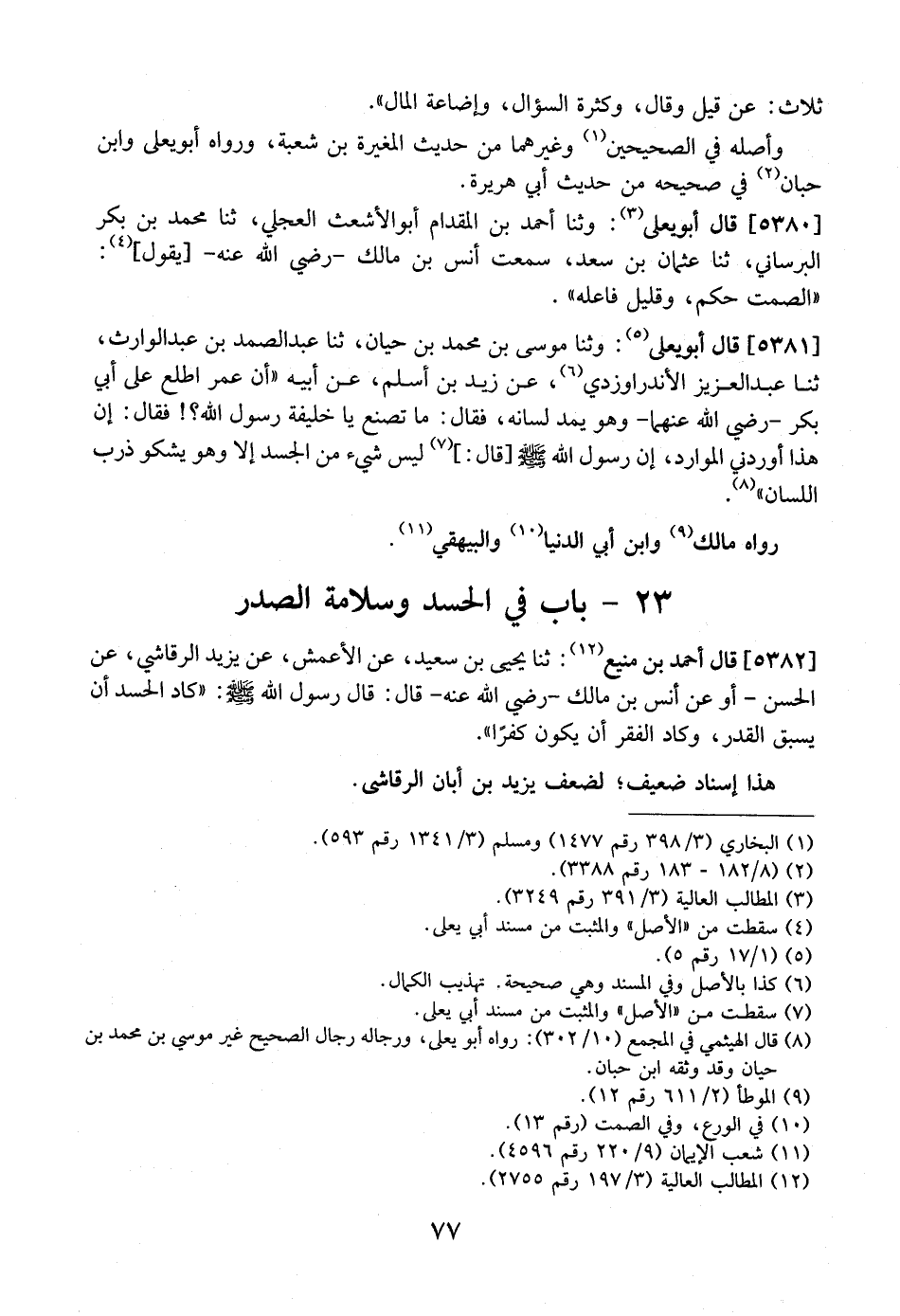 5380 - قَالَ أَبُو يَعْلَى: وَثَنَا أَحْمَدُ بْنُ الْمِقْدَامِ أَبُو الْأَشْعَثِ الْعِجْلِيُّ، ثَنَا مُحَمَّدُ بْنُ بَكْرٍ البرساني، ثنا عثمان بن سعد، سَمِعْتُ أَنَسَ بْنَ مَالِكٍ- رَضِيَ اللَّهُ عَنْهُ- يقول: "الصمت حكم، وَقَلِيلٌ فَاعِلُهُ".