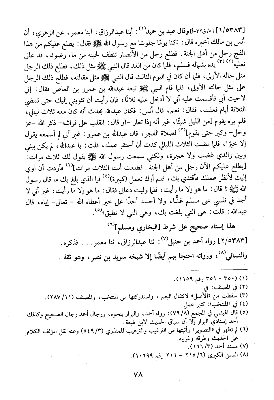 5383 / 1 - وقال عبد بن حميد: أبنا عبد الرزاق، أبنا مَعْمَرٌ، عَنِ الزُّهْرِيِّ، أَنَّ أَنَسَ بْنَ مَالِكٍ أخبره قَالَ: "كُنَّا يَوْمًا جُلُوسًا مَعَ رَسُولِ اللَّهِ - صَلَّى اللَّهُ عَلَيْهِ وَسَلَّمَ - فَقَالَ: يَطْلُعُ عَلَيْكُمْ مِنْ هَذَا الْفَجِّ رَجُلٌ مِنْ أَهْلِ الْجَنَّةِ. فَطَلَعَ رَجُلٌ مِنَ الْأَنْصَارِ تَنْطِفُ لِحْيَتُهُ مِنْ ماء وضوئه، قد علق نعليه يَدِهِ بِشِمَالِهِ فَسَلَّمَ، فَلَمَّا كَانَ مِنَ الْغَدِ قَالَ النَّبِيِّ - صَلَّى اللَّهُ عَلَيْهِ وَسَلَّمَ - مِثْلَ ذَلِكَ، فَطَلَعَ ذَلِكَ الرَّجُلُ مِثْلَ حَالِهِ الْأُولَى، فَلَمَّا أَنْ كَانَ فِي الْيَوْمِ الثَّالِثِ قَالَ النَّبِيُّ - صَلَّى اللَّهُ عَلَيْهِ وَسَلَّمَ - مِثْلَ مَقَالَتِهِ، فَطَلَعَ ذَلِكَ الرَّجُلُ عَلَى مِثْلِ حَالَتِهِ الْأُولَى، فَلَمَّا قَامَ النَّبِيُّ - صَلَّى اللَّهُ عَلَيْهِ وَسَلَّمَ - تَبِعَهُ عَبْدُ اللَّهِ بْنُ عَمْرِو بْنِ الْعَاصِ فَقَالَ: إِنُّي لَاحَيْتُ أَبِي فَأَقْسَمْتُ عَلَيْهِ أَنِّي لَا أَدْخُلُ عَلَيْهِ ثَلَاثًا، فَإِنْ رَأَيْتَ أَنْ تؤيني إِلَيْكَ حَتَّى تَمْضِيَ الثَّلَاثَةُ أَيَّامٍ فَعَلْتُ، فَقَالَ: نَعَمْ، قَالَ أَنَسٌ: فَكَانَ عَبْدُ اللَّهِ يُحَدِّثُ أنه كان معه ثلاث ليالي، فلم يره يقوم من الليل شيئاً، غير أنه إذا تعار- أو قال: انقلب على فراشه- ذكر الله- عز وجل- وكبر حتى يقوم، لِصَلَاةِ الْفَجْرِ، قَالَ عَبْدُ اللَّهِ بْنُ عَمْرٍو: غَيْرَ أَنِّي لَمْ أَسْمَعْهُ يَقُولُ إِلَّا خَيْرًا، فَلَمَّا مَضَتِ الثَّلَاثُ اللَّيَالِي كِدْتُ أَنْ أَحْتَقِرَ عَمَلَهُ، قُلْتُ: يَا عَبْدَ اللَّهِ، لَمْ يَكُنْ بَيْنِي وَبَيْنَ وَالِدِي غَضَبٌ وَلَا هِجْرَةٌ، وَلَكِنِّي سمعت رسول الله - صلى الله عليه وسلم - يقول لك ثلاث مرات: يَطْلُعُ عَلَيْكُمُ الْآنَ رَجُلٌ مِنْ أَهْلِ الْجَنَّةِ. فطلعت أنت الثلاث مَرَّاتٍ، فَأَرَدْتُ أَنْ آوِيَ إِلَيْكَ لِأَنْظُرَ عَمَلَكَ فَأَقْتَدِيَ بِكَ، فَلَمْ أَرَكَ تَعْمَلُ كَبِيرَةً فَمَا الَّذِي بَلَغَ بِكَ مَا قَالَ رَسُولُ اللَّهِ - صَلَّى اللَّهُ عَلَيْهِ وَسَلَّمَ -؟ قَالَ: مَا هُوَ إِلَّا مَا رَأَيْتَ، فَلَمَّا وَلَّيْتُ دَعَانِي فَقَالَ: مَا هُوَ إِلَّا مَا رَأَيْتَ، غَيْرَ أَنِّي لَا أَجِدُ فِي نَفْسِي عَلَى مُسْلِمٍ غِشًّا، وَلَا أَحْسُدُ أَحَدًا عَلَى خَيْرٍ أَعْطَاهُ اللَّهُ- تَعَالَى- إِيَّاهُ، قَالَ عَبْدُ اللَّهِ: قُلْتُ: هِيَ الَّتِي بَلَغَتْ بِكَ، وَهِيَ الَّتِي لَا نُطِيقُ".