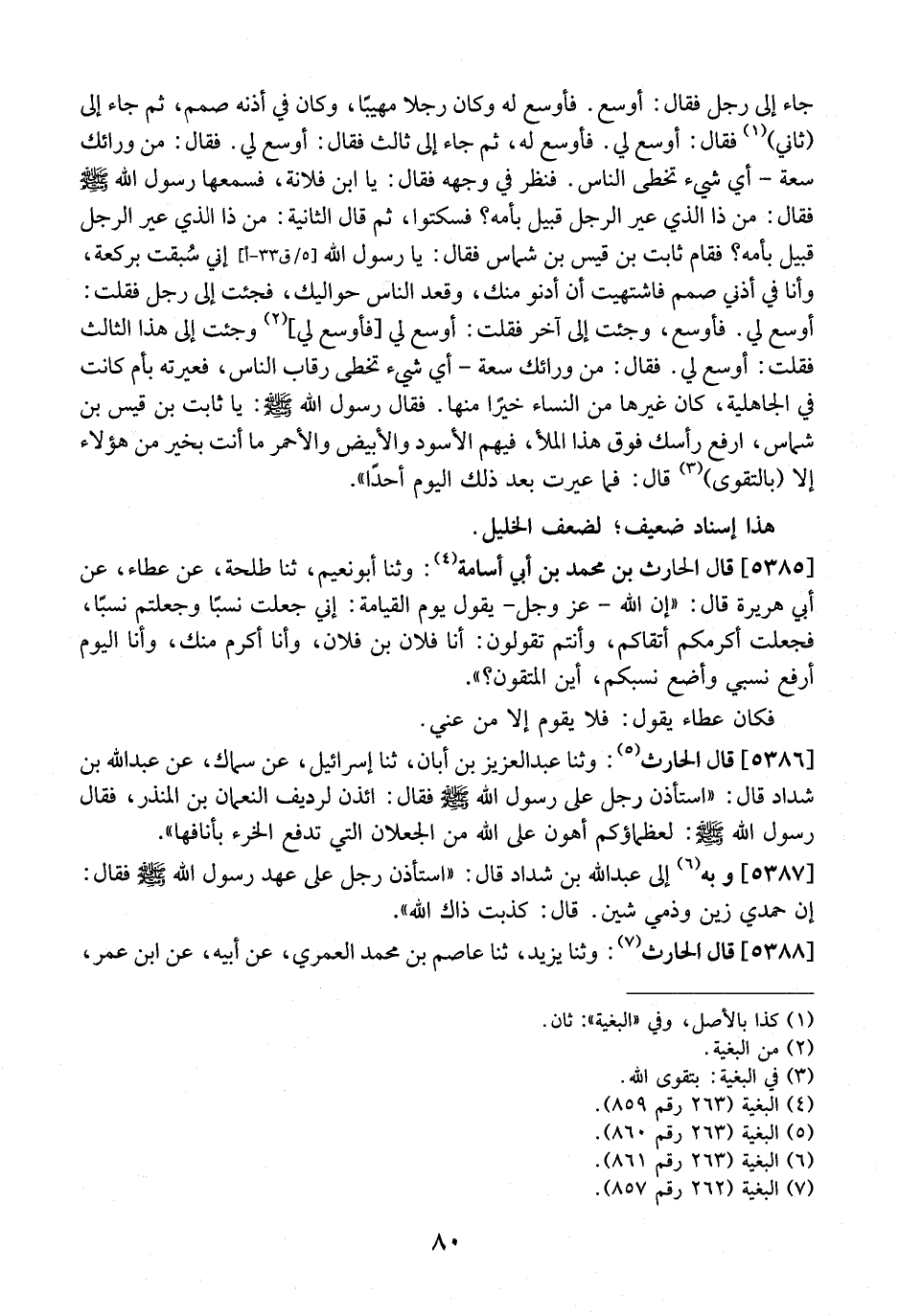 5385 - قَالَ الْحَارِثُ بْنُ مُحَمَّدِ بْنِ أَبِي أُسَامَةَ: وَثَنَا أَبُو نُعَيْمٍ، ثَنَا طَلْحَةُ، عَنْ عَطَاءٍ، عَنِ أَبِي هُرَيْرَةَ قَالَ: "إِنَّ اللَّهَ- عَزَّ وَجَلّ- يَقُولُ يَوْمَ الْقِيَامَةِ: إِنِّي جَعَلْتُ نَسَبًا وَجَعَلْتُمْ نَسَبًا، فَجَعَلْتُ أَكْرَمَكُمْ أَتْقَاكُمْ، وَأَنْتُمْ تَقُولُونَ: أَنَا فُلَانُ بْنُ فُلَانٍ، وَأَنَا أَكْرَمُ مِنْكَ، وَأَنَا الْيَوْمَ أَرْفَعُ نَسَبِي وَأَضَعُ نَسَبَكُمْ، أَيْنَ الْمُتَّقُونَ؟ ".