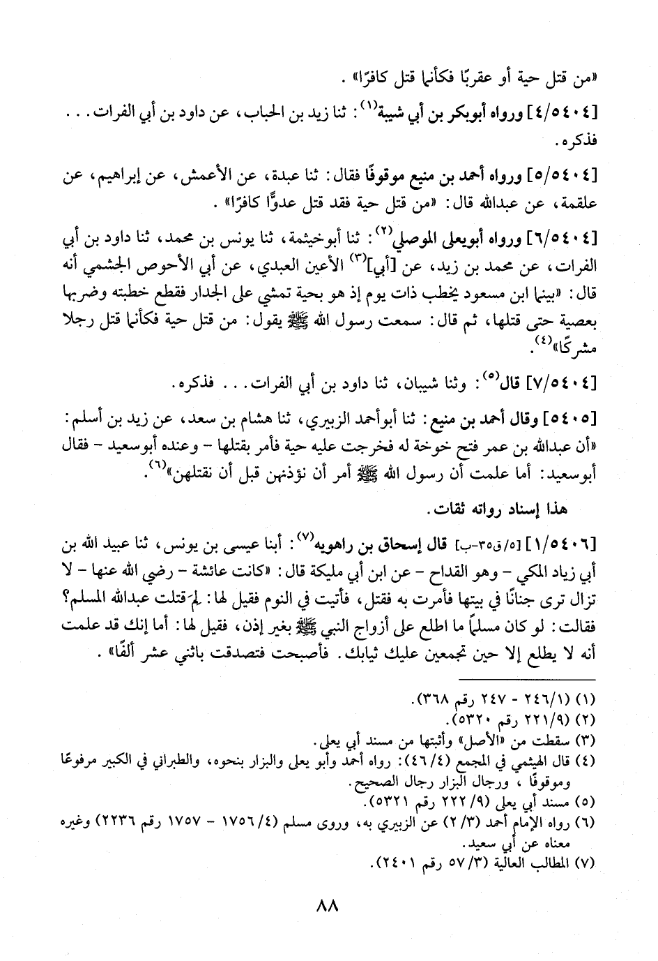 5404 / 6 - وَرَوَاهُ أَبُو يَعْلَى الْمَوْصِلِيُّ: ثَنَا أَبُو خَيْثَمَةَ، ثَنَا يُونُسُ بْنُ مُحَمَّدٍ، ثَنَا دَاوُدُ بْنُ أَبِي الْفُرَاتِ، عَنْ مُحَمَّدِ بْنِ زَيْدٍ، عَنْ أبي الأعين الْعَبْدِيِّ، عَنْ أَبِي الْأَحْوَصِ الْجُشَمِيِّ أَنَّهُ قَالَ: "بَيْنَمَا ابْنُ مَسْعُودٍ يَخْطُبُ ذَاتَ يَوْمٍ إِذْ هُوَ بِحَيَّةٍ تَمْشِي عَلَى الْجِدَارِ فَقَطَعَ خُطْبَتَهُ وَضَرَبَهَا بِعِصِيِّهِ حَتَّى قَتَلَهَا، ثُمَّ قَالَ: سَمِعْتُ رَسُولَ اللَّهِ - صَلَّى اللَّهُ عَلَيْهِ وَسَلَّمَ - يَقُولُ: مَنْ قَتَلَ حية فكأنما قَتَلَ رَجُلًا مُشْرِكًا".