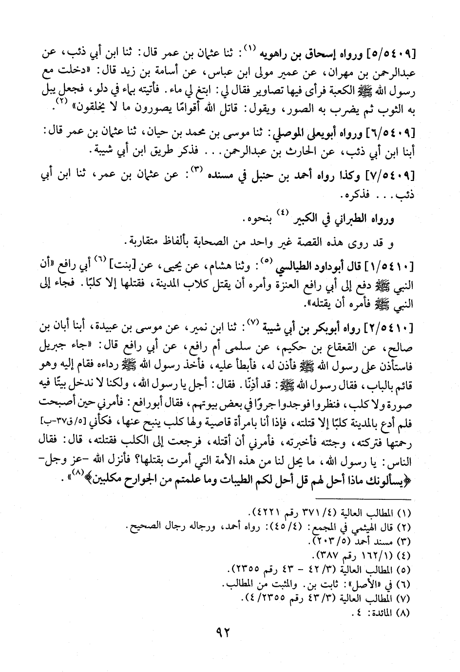 5410 / 2 - رَوَاهُ أَبُو بَكْرِ بْنُ أَبِي شَيْبَةَ: ثَنَا ابْنُ نُمَيْرٍ، عَنْ مُوسَى بن عبيدة، أبنا أَبَانُ بْنُ صَالِحٍ، عَنِ الْقَعْقَاعِ بْنِ حَكِيمٍ، عَنْ سَلْمَى أُمِّ رَافِعٍ، عَنْ أَبِي رَافِعٍ قَالَ: " جَاءَ جِبْرِيلُ فَاسْتَأْذَنَ عَلَى رَسُولِ اللَّهِ - صَلَّى اللَّهُ عَلَيْهِ وَسَلَّمَ - فَأَذِنَ لَهُ، فَأَبْطَأَ عَلَيْهِ، فَأَخَذَ رَسُولُ اللَّهِ - صَلَّى اللَّهُ عَلَيْهِ وَسَلَّمَ - رِدَاءَهُ فَقَامَ إِلَيْهِ وَهُوَ قَائِمٌ بِالْبَابِ، فَقَالَ رَسُولُ اللَّهِ - صَلَّى اللَّهُ عَلَيْهِ وَسَلَّمَ -: قَدْ أَذِنَّا. فَقَالَ: أَجَلْ يَا رَسُولَ اللَّهِ، وَلَكِنَّا لَا نَدْخُلُ بَيْتًا فِيهِ صُورَةٌ وَلَا كَلْبٌ، فَنَظَرُوا فَوَجَدُوا جَرْوًا فِي بَعْضِ بِيُوتِهِمْ، فَقَالَ أَبُو رَافِعٍ: فَأَمَرَنِي حِينَ أَصْبَحْتُ فَلَمْ أَدَعْ بِالْمَدِينَةِ كَلْبًا إِلَّا قَتَلْتُهُ، فَإِذَا أَنَا بِامْرَأَةٍ قَاصِيَةٍ وَلَهَا كَلْبٌ ينبح عَنْهَا، فَكَأَنِّي رَحِمْتُهَا فَتَرَكْتُهُ، وَجِئْتُهُ فَأَخْبَرْتُهُ، فَأَمَرَنِي أَنْ أَقْتُلَهُ، فَرَجَعْتُ إِلَى الْكَلْبِ فَقَتَلْتُهُ، قَالَ: فَقَالَ النَّاسُ: يَا رَسُولَ اللَّهِ، مَا يَحِلُّ لَنَا مِنَ هَذِهِ الْأُمَّةِ الَّتِي أَمَرْتَ بِقَتْلِهَا؟ فأنزل الله- عز وجل- (ويسألونك مَاذَا أُحِلَّ لَهُمْ قُلْ أُحِلَّ لَكُمُ الطَّيِّبَاتُ وما علمتم من الجوارح مكلبين".