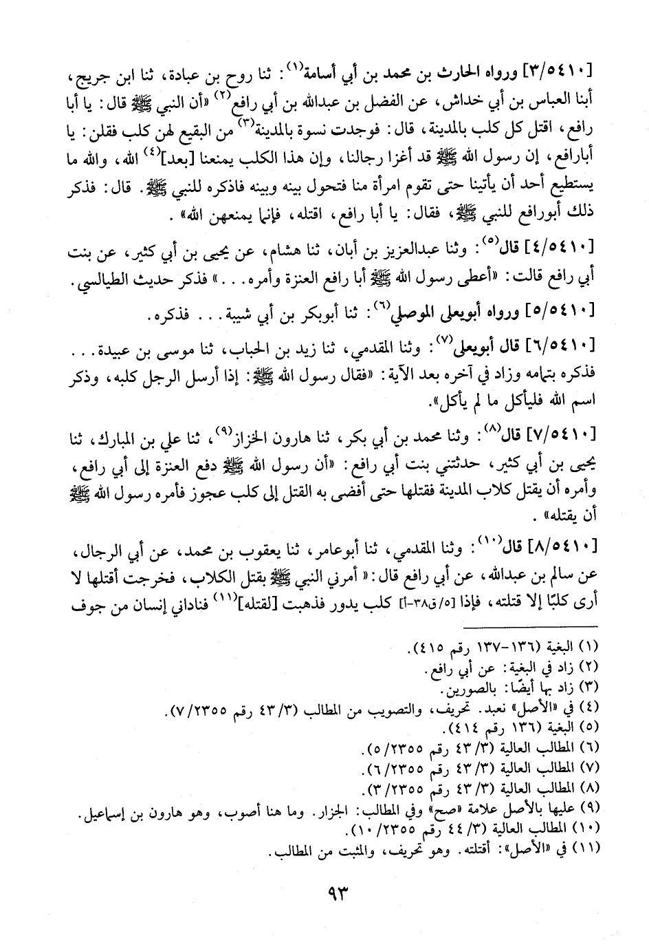 5410 / 3 - وَرَوَاهُ الْحَارِثُ بْنُ مُحَمَّدِ بْنِ أَبِي أُسَامَةَ: ثَنَا رَوْحُ بْنُ عُبَادَةَ، ثَنَا ابْنُ جُرَيْجٍ، أبنا الْعَبَّاسُ بْنُ أَبِي خِدَاشٍ، عَنِ الْفَضْلِ بْنِ عبد الله بْنِ أَبِي رَافِعٍ "أَنَّ النَّبِيَّ - صَلَّى اللَّهُ عَلَيْهِ وَسَلَّمَ - قَالَ: يَا أَبَا رَافِعٍ، اقْتُلْ كُلَّ كَلْبٍ بِالْمَدِينَةِ، قَالَ: فَوَجَدْتُ نِسْوَةً بِالْمَدِينَةِ مِنَ الْبَقِيعِ لَهُنَّ كَلْبٌ فَقُلْنَ: يَا أَبَا رَافِعٍ، أَنَّ رَسُولَ اللَّهِ - صَلَّى اللَّهُ عَلَيْهِ وسلم - قد أغزا رجالنا، وإن هذا الكلب يمنعنا بعد اللَّهَ، وَاللَّهِ مَا يَسْتَطِيعُ أَحَدٌ أَنْ يَأْتِيَنَا حَتَّى تَقُومَ امْرَأَةٌ مِنَّا فَتَحُولَ بَيْنَهُ وَبَيْنَهُ فَاذْكُرْهُ لِلنَّبِيِّ - صَلَّى اللَّهُ عَلَيْهِ وَسَلَّمَ - قَالَ: فَذَكَرَ ذَلِكَ أَبُو رَافِعٍ لِلنَّبِيِّ - صَلَّى اللَّهُ عَلَيْهِ وَسَلَّمَ - فَقَالَ: يَا أَبَا رَافِعٍ، اقْتُلْهُ، فَإِنَّمَا يَمْنَعُهُنَّ اللَّهَ".