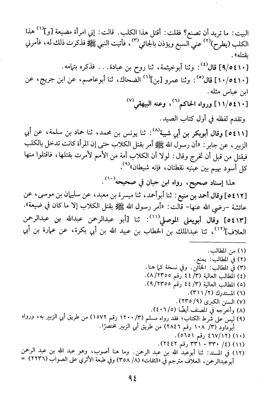 5411 - وَقَالَ أَبُو بَكْرِ بْنُ أَبِي شَيْبَةَ: ثنا يُونُسُ بْنُ مُحَمَّدٍ، ثَنَا حَمَّادُ بْنُ سَلَمَةَ، عَنْ أَبِي الزُّبَيْرِ، عَنْ جَابِرٍ: "أَنّ رَسُولَ اللَّهِ - صَلَّى اللَّهُ عَلَيْهِ وَسَلَّمَ - أَمَرَ بِقَتْلِ الْكِلَابِ حَتَّى أَنَّ الْمَرْأَةَ كَانَتْ تَدْخُلُ بِالْكَلْبِ فَيُقْتَلُ مِنْ قَبْلِ أَنْ تَخْرُجَ وَقَالَ: لَوْلَا أَنَّ الْكِلَابَ أُمَّةٌ مِنَ الْأُمَمِ لَأَمَرْتُ بِقَتْلِهَا، فَاقْتُلُوا مِنْهَا كُلَّ أَسْوَدَ بَهِيمٍ بَيْنَ عَيْنَيْهِ نُقْطَتَانِ، فَإِنَّهُ شَيْطَانٌ".