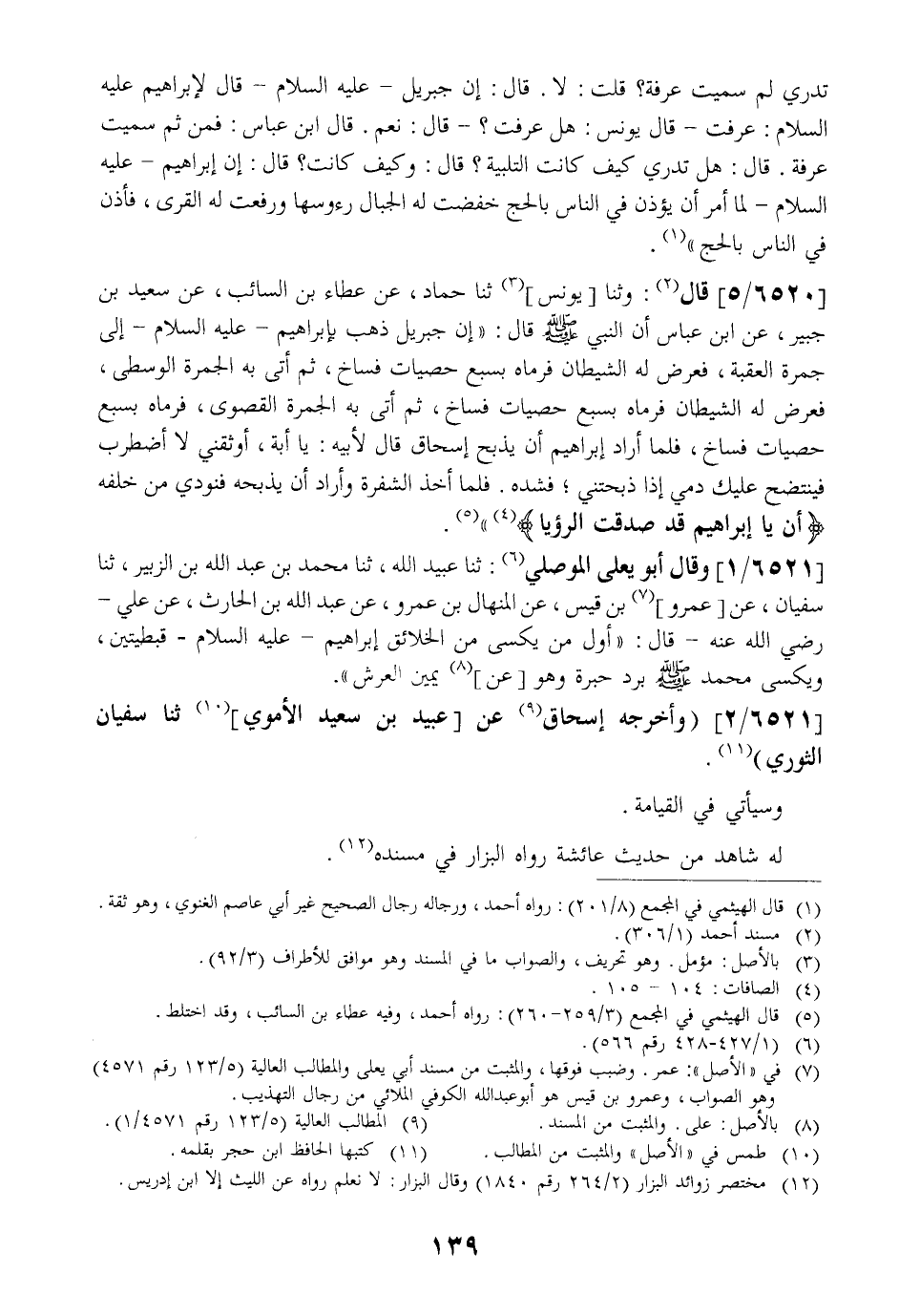 6520 / 5 - قَالَ: وَثَنَا يونس ثنا حداد عَنْ عَطَاءِ بْنِ السَّائِبِ عَنْ سَعِيدِ بْنِ جُبَيْرٍ عَنِ ابْنِ عَبَّاسٍ أَنّ النَّبِيَّ - صَلَّى اللَّهُ عَلَيْهِ وَسَلَّمَ - (قَالَ: " إِنَّ جِبْرِيلَ ذَهَبَ بِإِبْرَاهِيمَ- عَلَيْهِ السَّلَامُ- إِلَى جَمْرَةِ الْعَقَبَةِ فَعَرَضَ لَهُ الشَّيْطَانُ فَرَمَاهُ بِسَبْعِ حَصَيَاتٍ فَسَاخَ ثُمَّ أتى به الجمرة الْوُسْطَى فَعَرَضَ لَهُ الشَّيْطَانُ فَرَمَاهُ بِسَبْعِ حَصَيَاتٍ فَسَاخَ ثُمَّ أَتَى بِهِ الْجَمْرَةِ الْقُصْوَى فَرَمَاهُ بسبع حصيات فساخ فلمأراد إبراهيم أن يذبح إسحاق قال لأبيه: ياأبة أوثقني لأضطرب فينتضح عَلَيْكَ دَمِي إِذَا ذَبَحْتَنِي؟ فَشَدَّهُ. فَلَمَّا أَخَذَ الشَّفْرَةَ وَأَرَادَ أَنْ يَذْبَحَهُ فَنُودِيَ مِنْ خَلْفِهِ {أن ياأبراهيم قد صدقت الرؤيا} ".