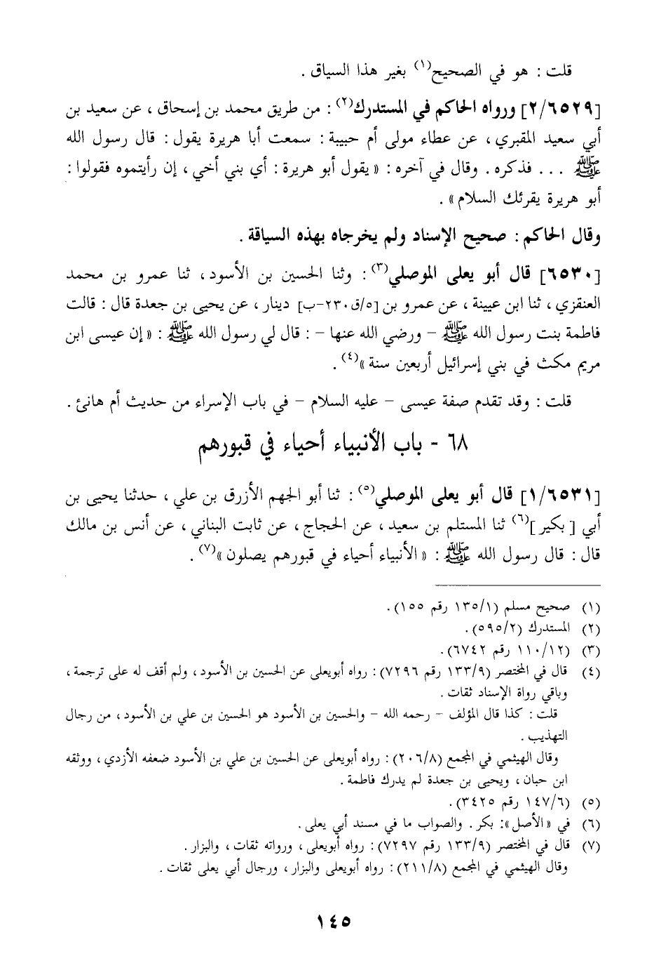 6531 / 1 - قَالَ أَبُو يَعْلَى الْمَوْصِلِيُّ: ثَنَا أَبُو الْجَهْمِ الْأَزْرَقُ بْنُ علي حدثنا يحيى بن أبي بكير ثَنَا الْمُسْتَلِمُ بْنُ سَعِيدٍ عَنِ الْحَجَّاجَ عَنْ ثَابِتٍ الْبُنَانِيِّ عَنْ أَنَسِ بْنِ مَالِكٍ قَالَ: قَالَ رَسُولُ اللَّهِ - صَلَّى اللَّهُ عَلَيْهِ وسلم - الْأَنْبِيَاءُ أَحْيَاءٌ فِي قُبُورِهِمْ يُصَلُّونَ ".