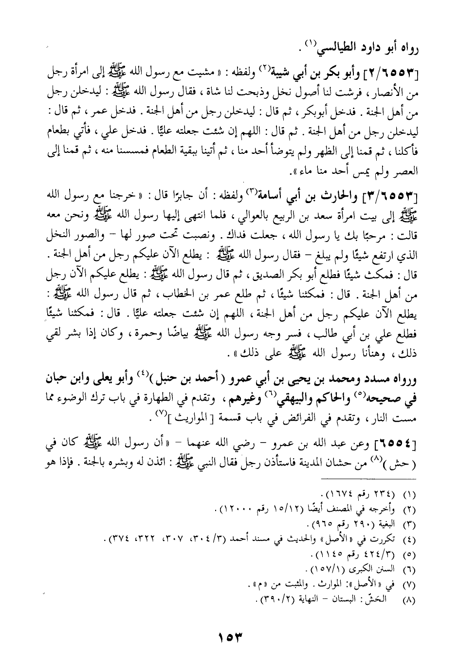 6553 / 3 - وَالْحَارِثُ بْنُ أَبِي أُسَامَةَ وَلَفْظُهُ: أَنَّ جَابِرًا قَالَ: " خَرَجْنَا مَعَ رَسُولِ اللَّهِ - صَلَّى اللَّهُ عَلَيْهِ وَسَلَّمَ - إِلَى بَيْتِ امْرَأَةِ سَعْدِ بْنِ الرَّبِيعِ بِالْعَوَالِيَ فلم انْتَهَى إِلَيْهَا رَسُولُ اللَّهِ - صَلَّى اللَّهُ عَلَيْهِ وَسَلَّمَ - وَنَحْنُ مَعَهُ قَالَتْ: مَرْحَبًا بِكَ يَا رسول الله جعلت فداك. ونصبت تحت صور لها- والصور النخل الذي ارتفع شيئًا ولم يبلغ- فَقَالَ رَسُولُ اللَّهِ - صَلَّى اللَّهُ عَلَيْهِ وَسَلَّمَ -: يَطْلُعُ الْآنَ عَلَيْكُمْ رَجُلٌ مِنْ أَهْلِ الْجَنَّةِ. قَالَ: فَمَكَثَ شَيْئًا فَطَلَعَ أَبُو بَكْرٍ الصِّدِّيقُ ثُمَّ قَالَ رَسُولُ اللَّهِ - صَلَّى اللَّهُ عَلَيْهِ وَسَلَّمَ -: يَطْلُعُ عَلَيْكُمُ الْآنَ رَجُلٌ مِنْ أَهْلِ الْجَنَّةِ. قَالَ: فَمَكَثْنَا شَيْئًا ثُمَّ طَلَعَ عُمَرُ بْنُ الْخَطَّابِ ثُمَّ قَالَ رَسُولُ اللَّهِ - صَلَّى اللَّهُ عَلَيْهِ وَسَلَّمَ -: يَطْلُعُ الْآنَ عَلَيْكُمْ رَجُلٌ مِنْ أَهْلِ الْجَنَّةِ اللَّهُمَّ إِنْ شِئْتَ جَعَلْتَهُ عَلِيًّا. قَالَ: فَمَكَثْنَا شَيْئًا فَطَلَعَ عَلَيُّ بْنُ أبي طالب فسر وَجْهَ رَسُولِ اللَّهِ - صَلَّى اللَّهُ عَلَيْهِ وَسَلَّمَ - بَيَاضًا وَحُمْرَةً وَكَانَ إِذَا بُشِّرَ لُقِيَ ذَلِكَ وهنأنا رسول الله - صلى الله عليه وسلم - على ذَلِكَ ".