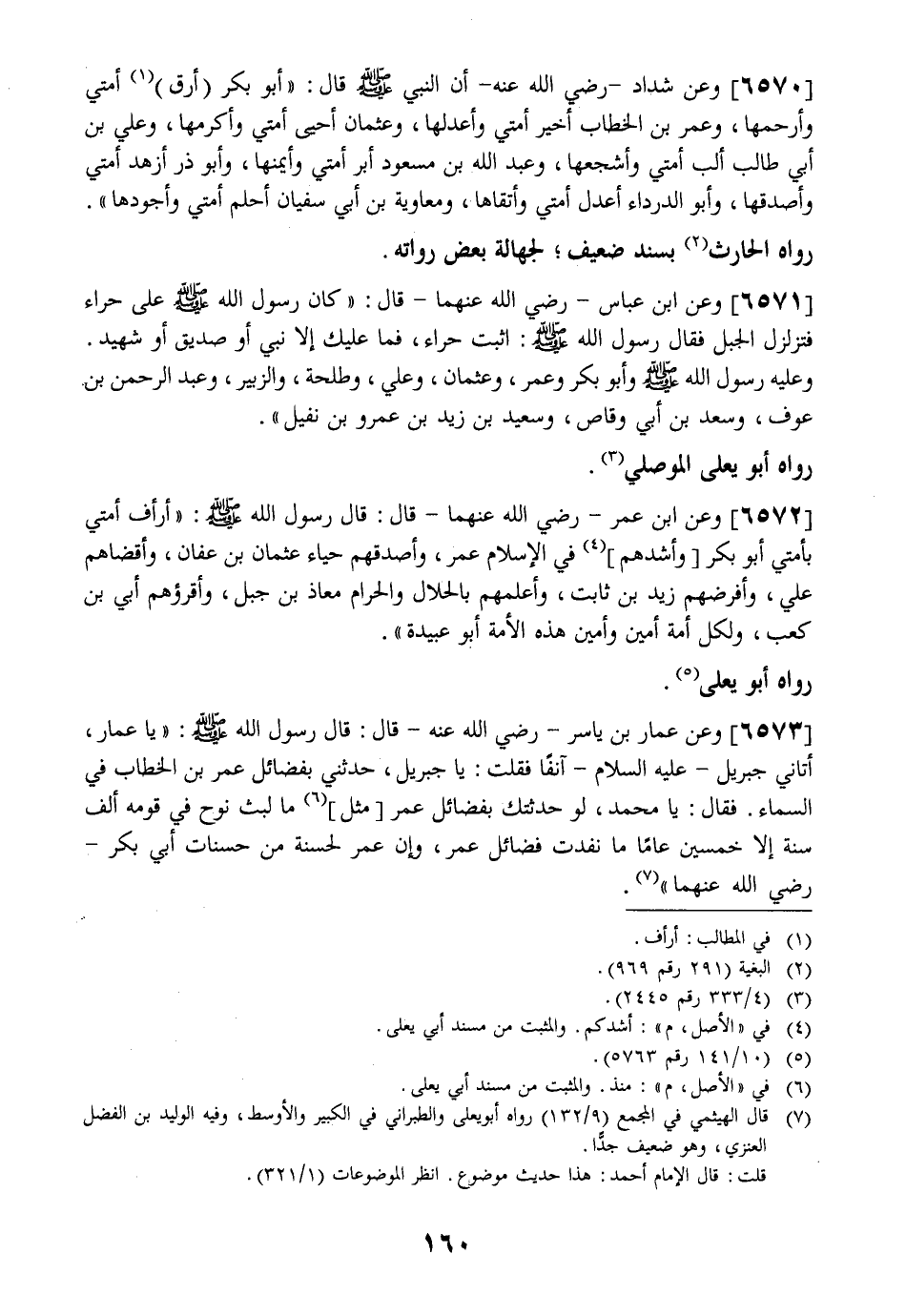 6573 - وَعَنْ عَمَّارِ بْنِ يَاسِرٍ- رَضِيَ اللَّهُ عَنْهُ- قَالَ: قَالَ رَسُولُ اللَّهِ - صَلَّى اللَّهُ عَلَيْهِ وَسَلَّمَ - " يَا عَمَّارُ أَتَانِيَ جِبْرِيلُ- عَلَيْهِ السَّلَامُ - آنِفًا فَقُلْتُ: يَا جِبْرِيلُ حَدِّثْنِي بِفَضَائِلِ عُمَرَ بْنِ الْخَطَّابِ فِي السَّمَاءِ. فَقَالَ: يَا مُحَمَّدُ لَوْ حَدَّثْتُكَ بِفَضَائِلِ عُمَرَ مِثْلَ مَا لَبِثَ نُوحٌ فِي قَوْمِهِ أَلْفَ سَنَةٍ إِلَّا خَمْسِينَ عَامًا مَا نَفِدَتْ فَضَائِلُ عُمَرَ وَإِنَّ عُمَرَ لَحَسَنَةٌ مِنْ حَسَنَاتِ أَبِي بَكْرٍ- رَضِيَ اللَّهُ عنهما".