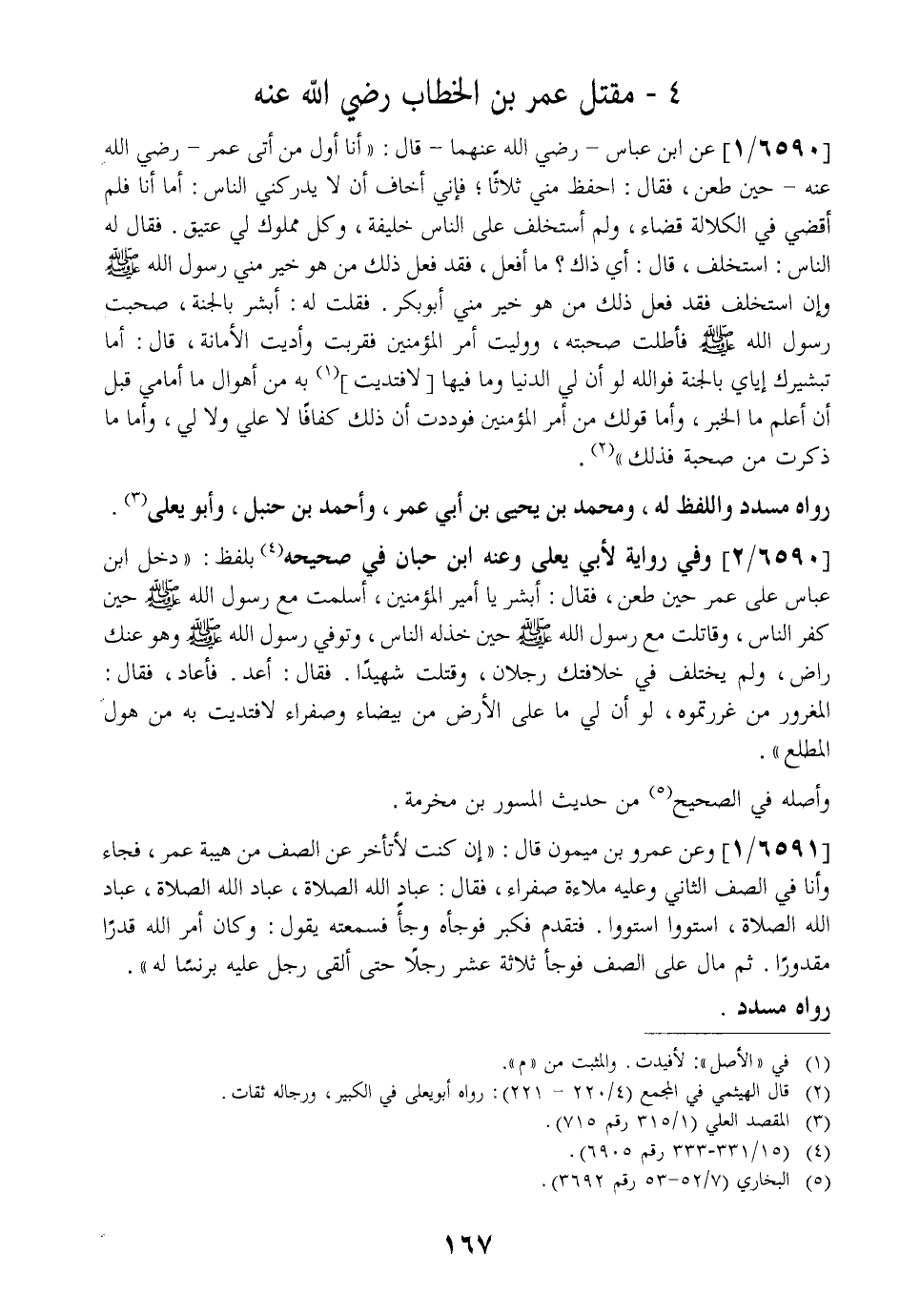 6590 / 1 - عَنِ ابْنِ عَبَّاسٍ- رَضِيَ اللَّهُ عَنْهُمَا- قَالَ: " أَنَا أَوَّلُ مَنْ أَتَى عُمَرَ- رَضِيَ اللَّهُ عَنْهُ- حِينَ طُعِنَ فَقَالَ: احْفَظْ مِنِّي ثَلَاثًا فَإِنِّي أَخَافُ أَنْ لَا يُدْرِكَنِي النَّاسُ: أَمَّا أنا فلم أقضي فِي الْكَلَالَةِ قَضَاءً وَلَمْ أَسْتَخْلِفْ عَلَى النَّاسِ خليفة وكل مملوك لي عتيق. فقال لَهُ النَّاسُ: اسْتَخْلِفْ قَالَ: أَيْ ذَاكَ؟ مَا أَفْعَلُ فَقَدْ فَعَلَ ذَلِكَ مَنْ هُوَ خَيْرٌ مِنِّي رَسُولِ اللَّهِ - صَلَّى اللَّهُ عَلَيْهِ وَسَلَّمَ - وَإِنْ أَسْتَخْلِفُ فَقَدْ فَعَلَ ذَلِكَ مَنْ هُوَ خَيْرٌ مِنِّي أَبُو بَكْرٍ. فَقُلْتُ لَهُ: أَبْشِرْ بِالْجَنَّةِ صَحِبْتُ رَسُولَ اللَّهِ - صَلَّى اللَّهُ عَلَيْهِ وَسَلَّمَ - فَأَطَلْتَ صُحْبَتَهُ وَوُلِّيتَ أَمْرَ الْمُؤْمِنِينَ فَقَرَّبْتَ وَأَدَّيْتُ الْأَمَانَةَ قَالَ: أَمَّا تَبْشِيرُكَ إِيَّايَ بِالْجَنَّةِ فَوَاللَّهِ لَوْ أَنَّ لِي الدُّنْيَا وَمَا فِيهَا لَافْتَدَيْتُ بِهِ مِنْ أَهْوَالِ مَا أَمَامِي قَبْلَ أَنْ أَعْلَمَ مَا الْخَبَرُ وَأَمَّا قَوْلُكَ مِنْ أَمْرِ الْمُؤْمِنِينَ فَوَدَدْتُ أَنَّ ذَلِكَ كَفَافًا لَا عَلَيَّ وَلَا لِيَ وَأَمَّا مَا ذَكَرْتَ مِنْ صُحْبَةٍ فَذَلِكَ ".