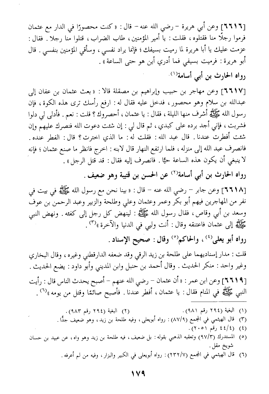 6616 - وَعَنْ أَبِي هُرَيْرَةَ- رَضِيَ اللَّهُ عَنْهُ- قَالَ: " كُنْتُ مَحْصُورًا فِي الدَّارِ مَعَ عُثْمَانَ فَرَمَوْا رَجُلًا مِنَّا فَقَتَلَوُهُ فَقُلْتُ: يَا أَمِيرَ الْمُؤْمِنِينَ طاب الضراب قتلوا منا رجلا. فَقَالَ: عَزَمْتُ عَلَيْكَ يَا أَبَا هُرَيْرَةَ لَمَا رميت بسيفك فإنما يراد نفسي وسأقي الْمُؤْمِنِينَ بِنَفْسِي. قَالَ أَبُو هُرَيْرَةَ: فَرَمَيْتُ بِسَيْفِي فَمَا أَدْرِي أَيْنَ هُوَ حَتَّى السَّاعَةِ ".