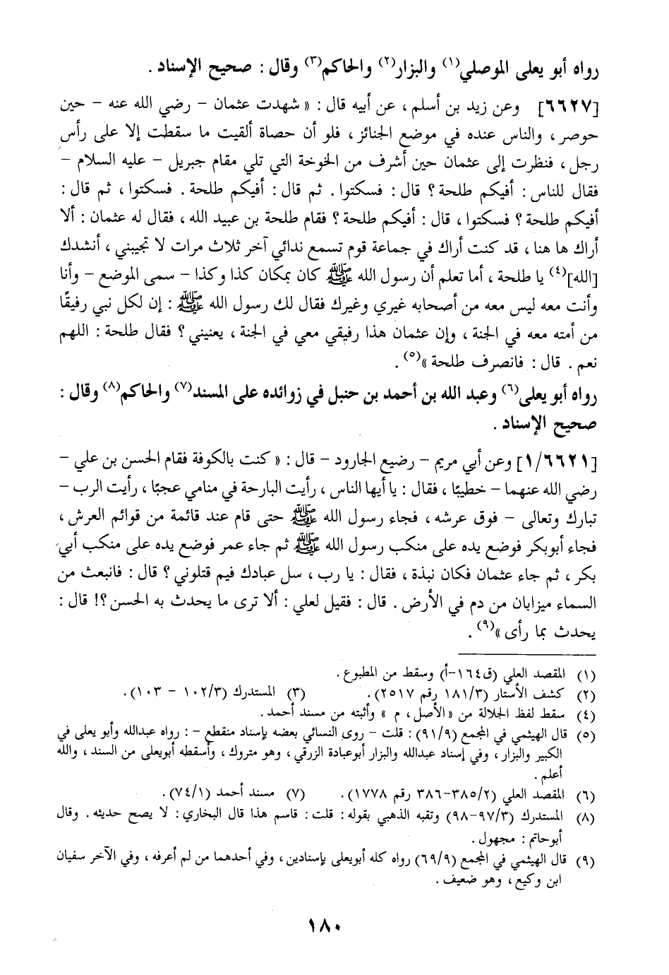 6620 - وَعَنْ زَيْدِ بْنِ أَسْلَمَ عَنْ أَبِيهِ قَالَ: " شَهِدْتُ عُثْمَانَ- رَضِيَ اللَّهُ عَنْهُ- حِينَ حُوصِرَ وَالنَّاسُ عِنْدَهُ فِي مَوْضِعِ الْجَنَائِزِ فَلَوْ أَنَّ حَصَاةً أُلْقِيَتْ مَا سَقَطَتَ إِلَّا عَلَى رَأَسِ رَجُلٍ فَنَظَرْتُ إِلَى عُثْمَانَ حِينَ أَشْرَفَ مِنَ الْخُوْخَةِ الَّتِي تَلِي مَقَامَ جِبْرِيلَ- عَلَيْهِ السَّلَامُ - فَقَالَ لِلنَّاسِ: أفيكم طلحة؟ قال: فسكتوا. ثم قال: أَفِيكُمُ طَلْحَةُ. فَسَكَتُوا ثُمَّ قَالَ: أَفِيكُمُ طَلْحَةُ؟ فَسَكَتُوا قَالَ: أفِيكُمُ طَلْحَةُ؟ فَقَامَ طَلْحَةُ بْنُ عُبَيْدِ اللَّهِ فَقَالَ لَهُ عُثْمَانُ: أَلَا أَرَاكَ ها هنا قَدْ كُنْتُ أَرَاكَ فِي جَمَاعَةِ قَوْمٍ تَسْمَعُ ندائي آخر ثلاث مرات لا تجيبني أنشدك الله يَا طَلْحَةُ أَمَا تَعْلَمْ أَنّ رَسُولَ اللَّهِ - صَلَّى اللَّهُ عَلَيْهِ وسلم - كان كان كذا وكذا- سمى الْمَوْضِعَ- وَأَنَا وَأَنْتَ مَعَهُ لَيْسَ مَعَهُ مِنْ أَصْحَابِهِ غَيْرِي وَغَيْرُكَ فَقَالَ لَكَ رَسُولُ اللَّهِ - صَلَّى اللَّهُ عَلَيْهِ وَسَلَّمَ - إِنَّ لِكُلِّ نَبِيِّ رَفِيقًا مِنْ أُمَّتِهِ مَعَهُ فِي الْجَنَّةِ وَإِنَّ عُثْمَانَ هَذَا رَفِيقِي مَعِيَ فِي الْجَنَّةِ يَعْنِينِي؟ فَقَالَ طَلْحَةُ: اللَّهُمَّ نَعَمْ. قَالَ: فَانْصَرَفَ طَلْحَةُ ".