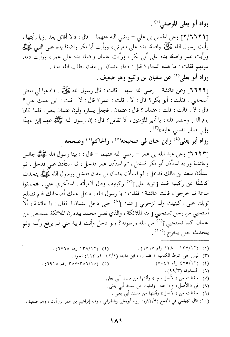 6621 / 2 - وَعَنِ الْحَسَنَ بْنَ عَلِيٍّ- رَضِيَ اللَّهُ عَنْهُمَا- قَالَ: لَا أُقَاتِلُ بَعْدَ رُؤْيَا رَأَيْتُهَا رَأَيْتُ رَسُولَ اللَّهِ - صَلَّى اللَّهُ عَلَيْهِ وَسَلَّمَ - وَاضِعًا يَدَهُ عَلَى الْعَرْشِ وَرَأَيْتُ أَبَا بَكْرٍ وَاضِعًا يَدَهُ عَلَى النَّبِيِّ - صَلَّى اللَّهُ عَلَيْهِ وَسَلَّمَ - وَرَأَيْتُ عُمَرَ وَاضِعًا يَدَهُ عَلَى أَبِي بَكْرٍ وَرَأَيْتُ عُثْمَانَ وَاضِعًا يَدَهُ عَلَى عُمَرَ وَرَأَيْتُ دِمَاءً دُونَهُمْ فَقُلْتُ: مَا هَذِهِ الدِّمَاءُ؟ قِيلَ: دِمَاءُ عُثْمَانَ بْنِ عَفَّانَ يَطْلُبُ اللَّهَ بِهِ ".