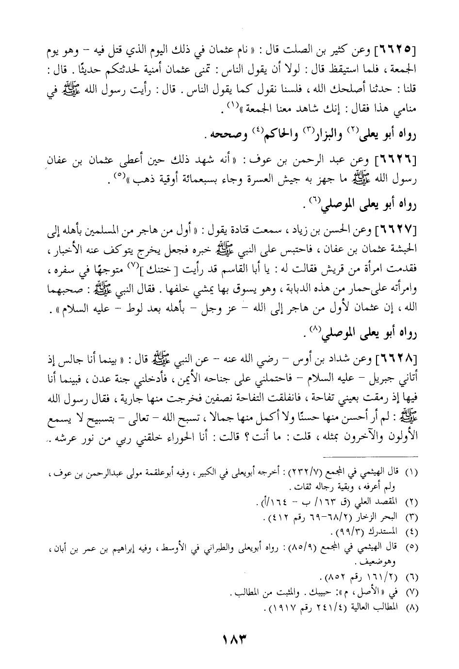 6625 - وَعَنْ كَثِيرِ بْنِ الصَّلْتِ قَالَ: " نَامَ عُثْمَانُ فِي ذَلِكَ الْيَوْمِ الَّذِي قُتِلَ فِيهِ- وَهُوَ يَوْمُ الْجُمُعَةِ فَلَمَّا اسْتَيْقَظَ قَالَ: لَوْلَا أَنْ يَقُولَ النَّاسُ: تَمَنَّى عُثْمَانُ أُمْنِيَةً لَحَدَّثْتُكُمْ حَدِيثًا قَالَ قُلْنَا: حَدِّثْنَا أَصْلَحَكَ اللَّهُ فَلَسْنَا نَقُولُ كَمَا يَقُولُ النَّاسُ. قَالَ: رَأَيْتُ رَسُولَ اللَّهِ - صَلَّى اللَّهُ عَلَيْهِ وَسَلَّمَ - فِي مَنَامِي هَذَا فَقَالَ: إِنَّكَ شَاهِدٌ مَعَنَا الْجُمُعَةَ".