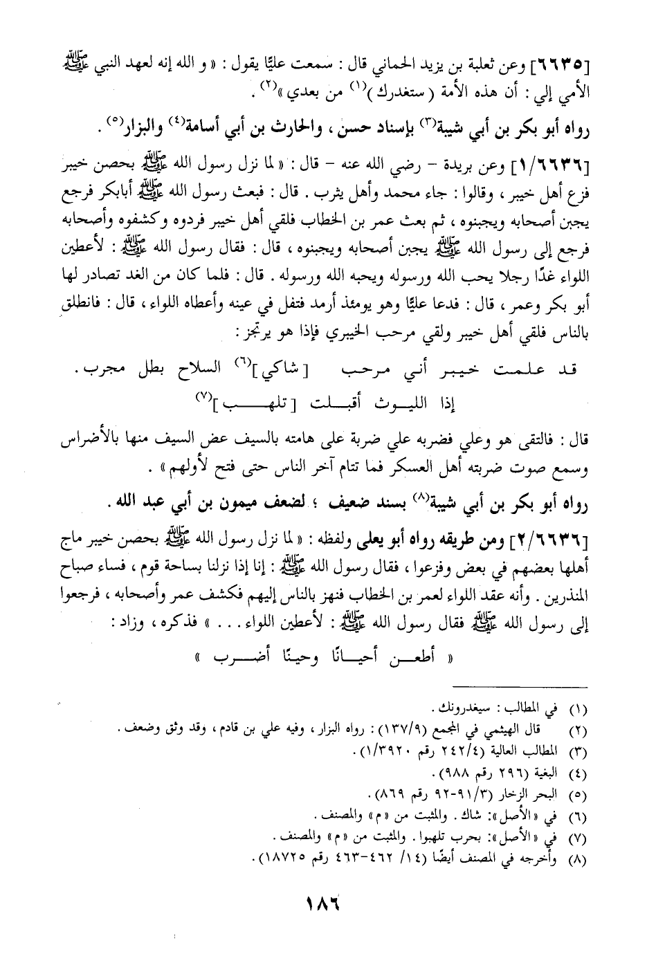 6636 / 2 - وَمِنْ طَرِيقِهِ رواه أبو يعلى وَلَفْظُهُ: " لَمَّا نَزَلَ رَسُولُ اللَّهِ - صَلَّى اللَّهُ عَلَيْهِ وَسَلَّمَ - بِحِصْنِ خَيْبَرَ مَاجَ أَهْلُهَا بَعْضُهُمْ فِي بَعْضٍ وَفَزِعُوا فَقَالَ رَسُولُ اللَّهِ - صَلَّى اللَّهُ عَلَيْهِ وَسَلَّمَ - إِنَّا إِذَا نَزَلْنَا بِسَاحَةِ قَوْمٍ فَسَاءَ صَبَاحُ الْمُنْذَرِينِ. وَإِنَّهُ عَقَدَ اللِّوَاءَ لِعُمَرَ بْنِ الْخَطَّابِ فَنَهَزَ بِالنَّاسِ إِلَيْهِمْ فَكُشِفَ عُمَرُ وَأَصْحَابُهُ فَرَجَعُوا إِلَى رَسُولِ اللَّهِ - صَلَّى اللَّهُ عَلَيْهِ وَسَلَّمَ - فَقَالَ رَسُولُ اللَّهِ - صَلَّى اللَّهُ عَلَيْهِ وَسَلَّمَ - لَأُعْطِيَنَّ اللُّوَاءَ ... " فَذَكَرَهُ وَزَادَ أَطْعَنُ أَحْيَانًا وَحِينًا أَضْرِبُ "